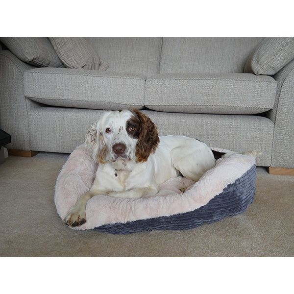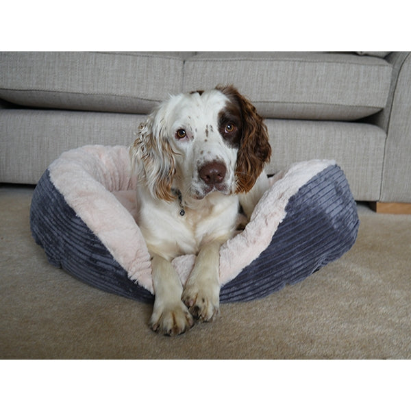 Soft and cosy padded grey cord/plush oval sleeper with a soft, luxury plush inner. Stylish and modern for today's home. Machine washable at 30°C.