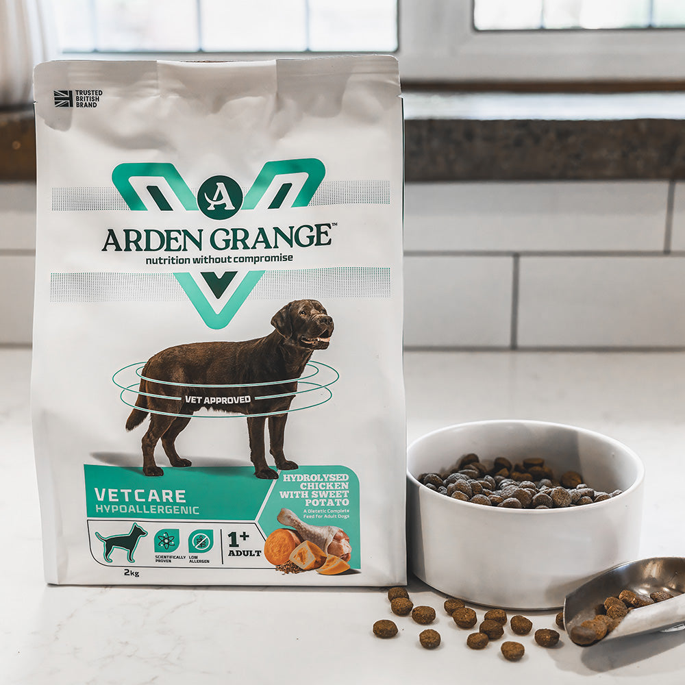 Our VetCare Hypoallergenic diet contains hydrolysed chicken protein, which is broken down into very small fragments to minimise potential triggers and reduce the risk of allergic reactions in dogs with food sensitivities.