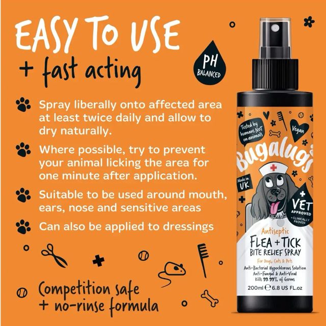 For the ultimate bug busting solution pair the Antiseptic Flea & Tick Bite Relief Spray with the Flea & Tick Dog Shampoo or Flea & Tick Cat Shampoo. Great, for washing our pets in the shower and repairing the damaged, bitten skin in-between washes.