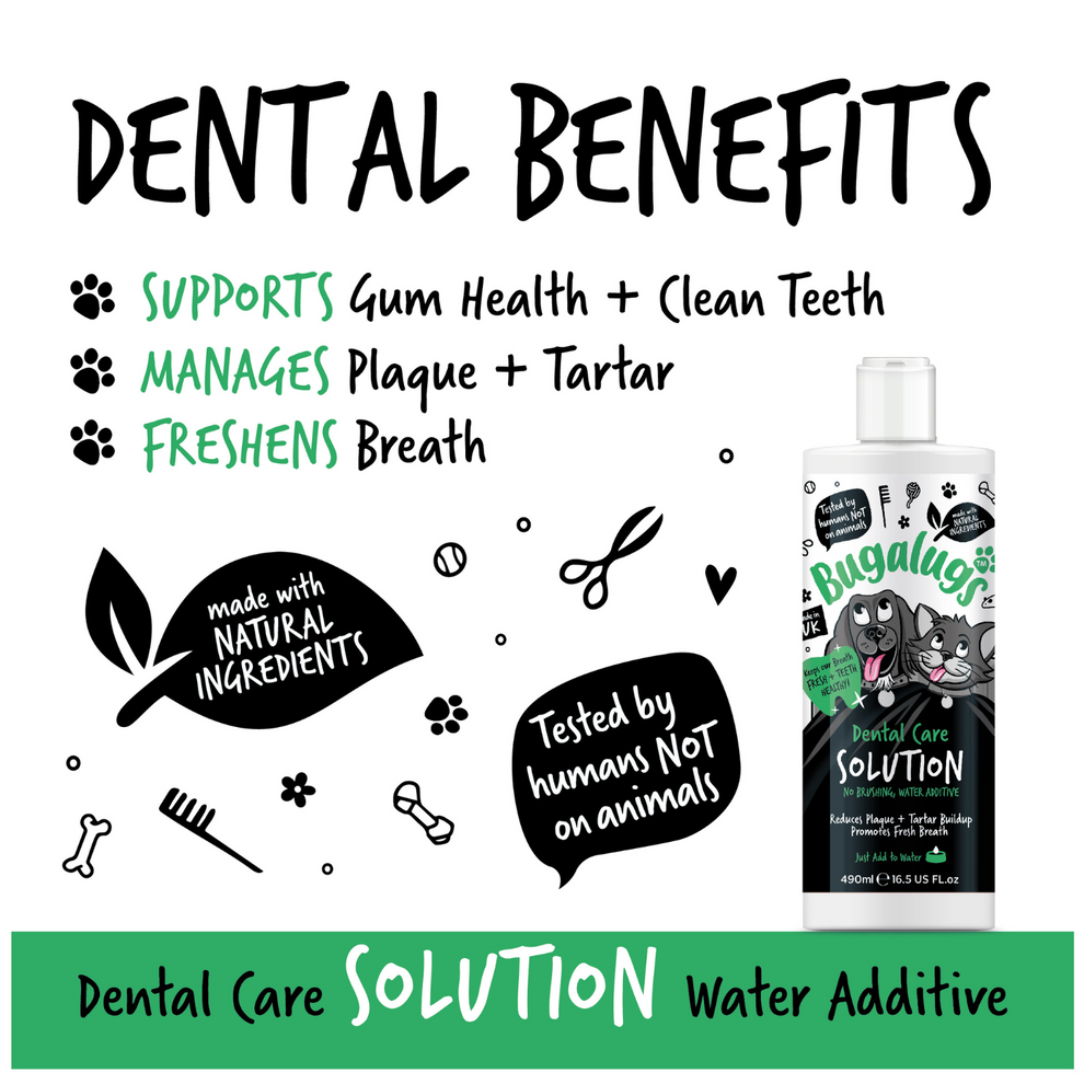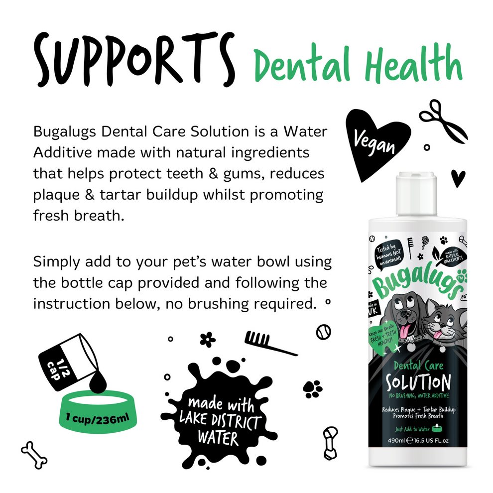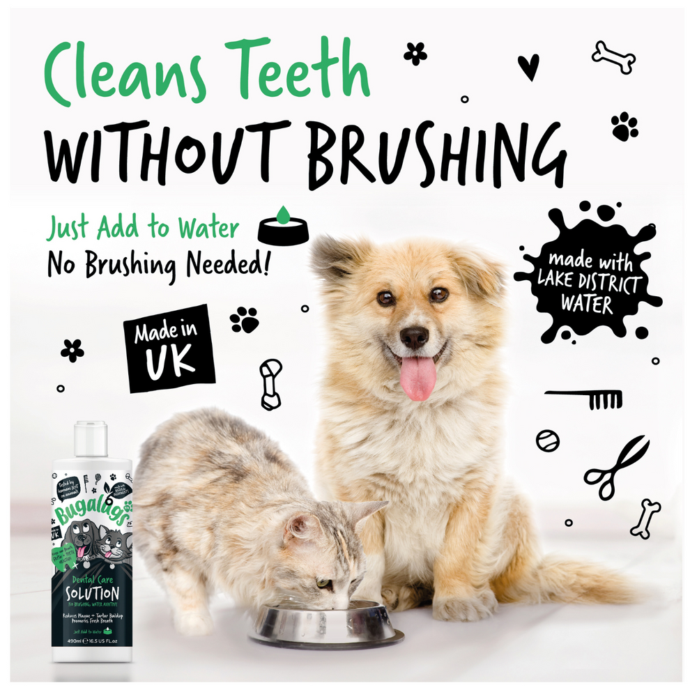 Bugalugs Dental Care Water Additive is the ultimate solution for effortlessly maintaining your furry friend’s oral health. This revolutionary dental care product, crafted with care in the UK’s Lake District, sets a new standard in pet oral hygiene by effectively addressing plaque and tartar build-up to safeguard your dogs’ and cats’ teeth and gums.
