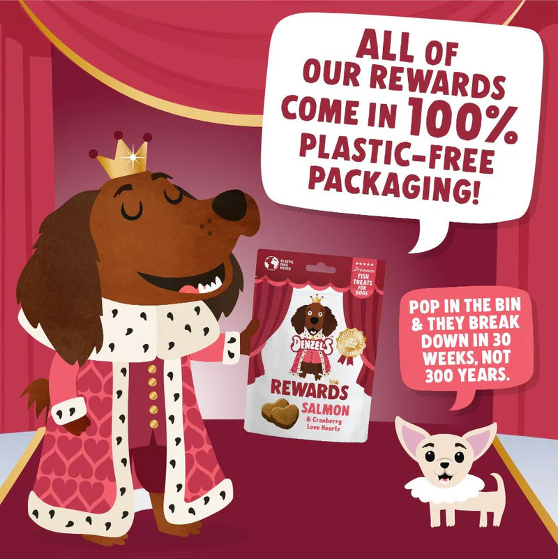 Whatsmore, Denzel's super premium rewards come in 100% plastic-free packs that won't harm our planet. Just pop the empty pouch in your regular bin when you're done and it will naturally break down in landfill within 30 weeks, not 300 years like single-use plastics. The perfect way to reward your pooch.