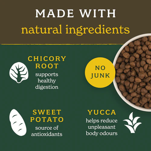 This grain-free dry food comes in bite-sized pellets and contains no junk or fillers that causes food to swell. A complete and balanced meal, you don't need to mix our dry food with anything else, but if you prefer to mix up mealtimes, it's the perfect companion to our complete wet food ranges.