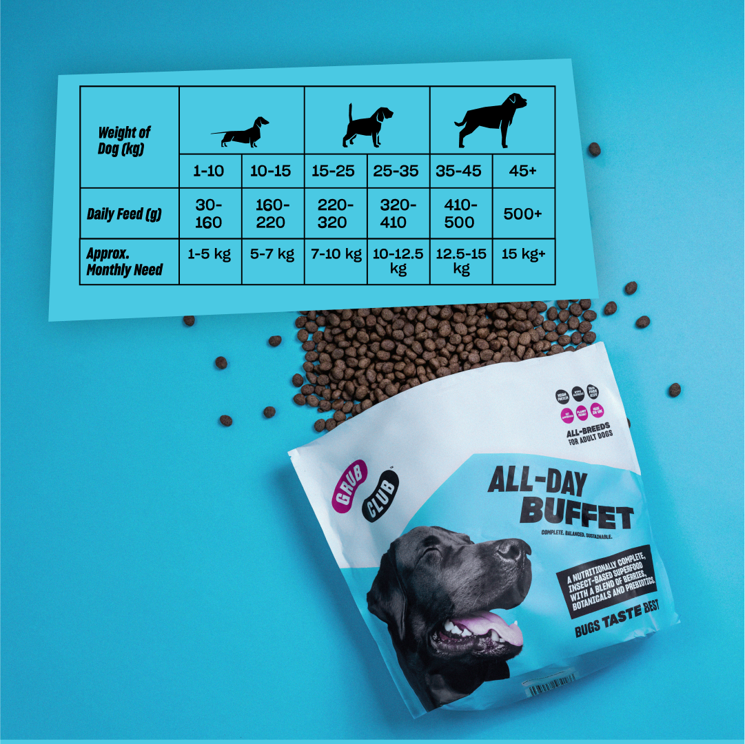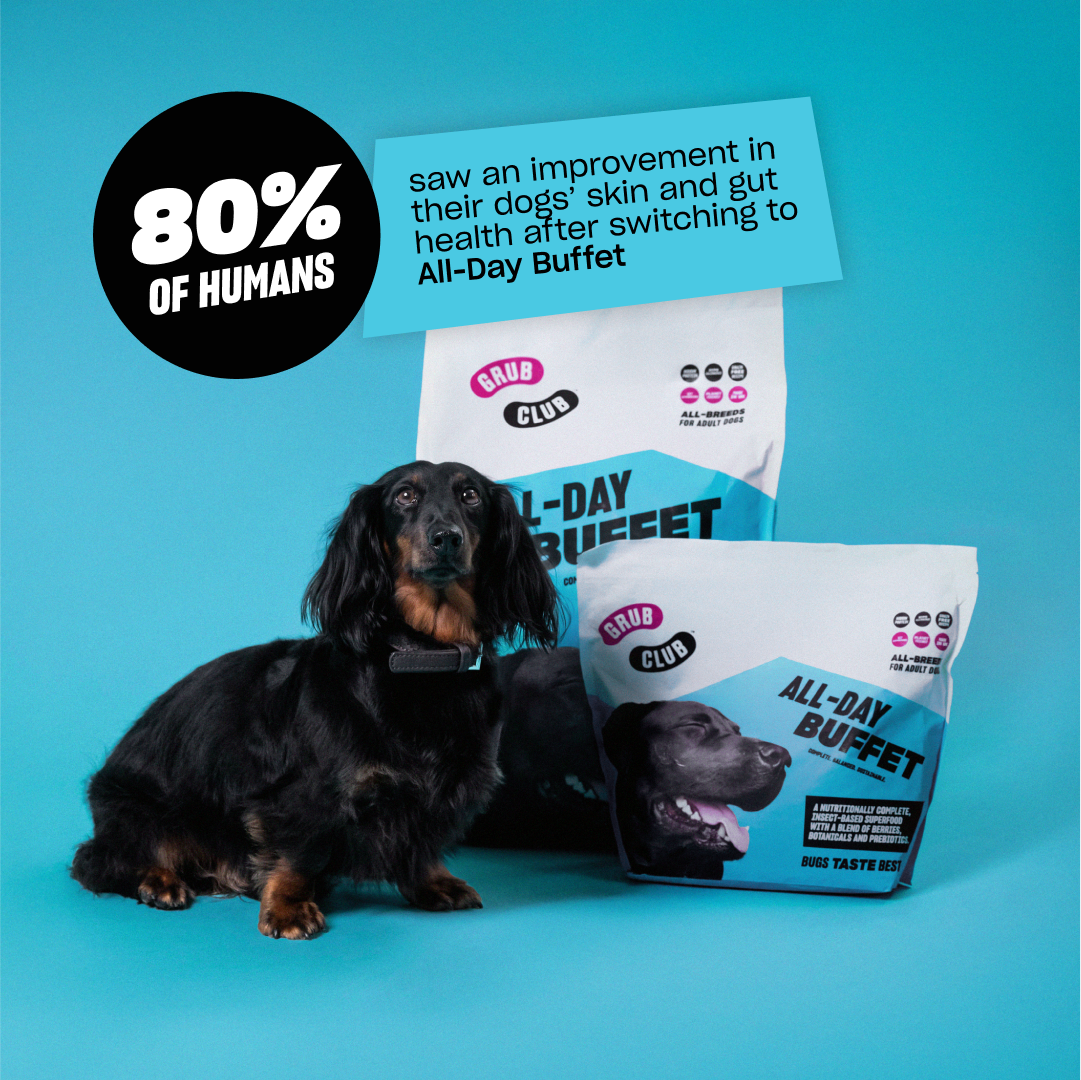 HYPOALLERGENIC: Our all-day buffet dog food is made with naturally hypoallergenic insect protein. Ideal and great alternative for dogs with meat-related allergies, fussy eaters and sensitive stomachs. Insect protein provides up to two times the amount of protein per 100g compared to beef.