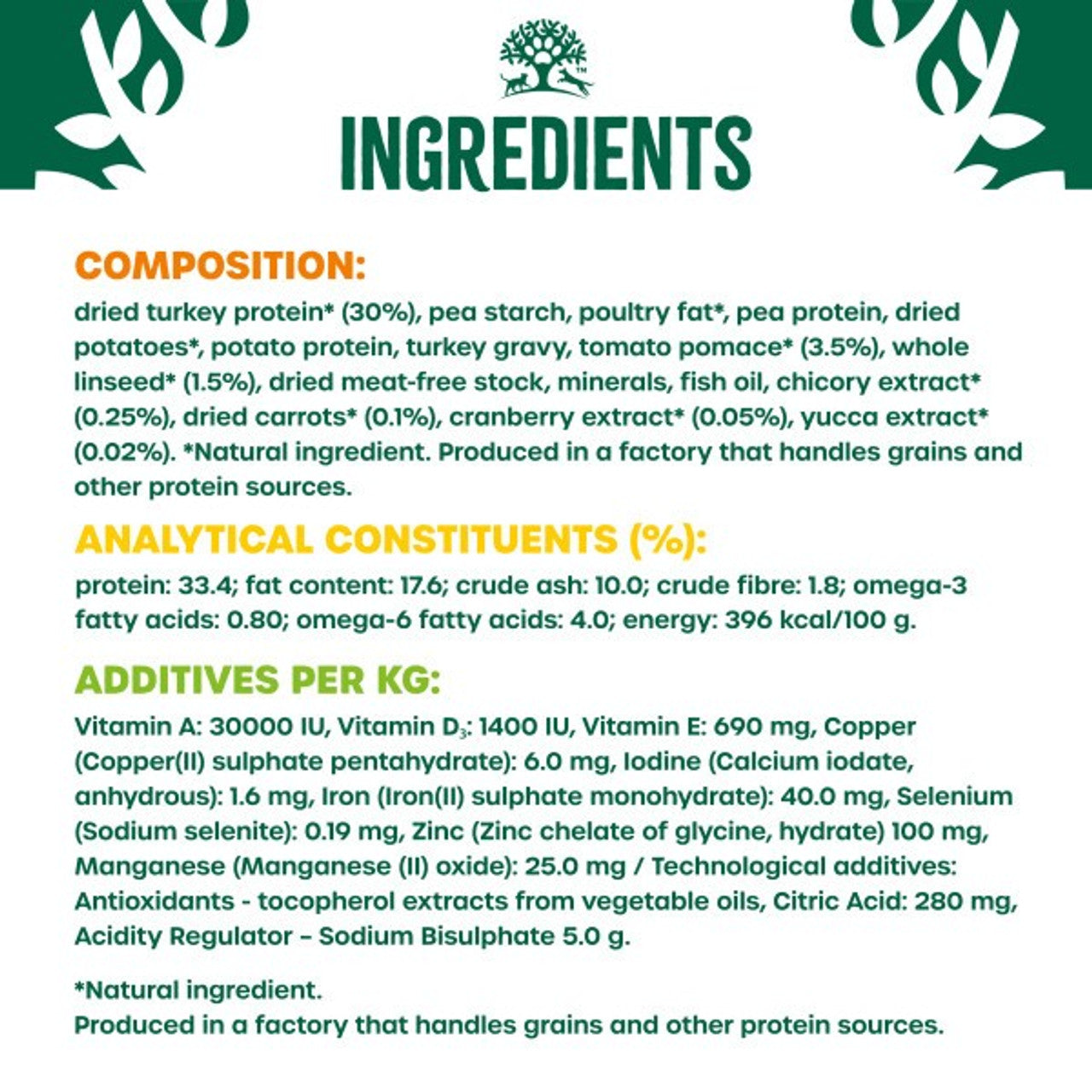 dried turkey protein* (30%), pea starch, poultry fat*, pea protein, dried potatoes*, potato protein, turkey gravy, tomato pomace* (3.5%), whole linseed* (1.5%), dried meat-free stock, minerals, fish oil, chicory extract* (0.25%), dried carrots* (0.1%), cranberry extract* (0.05%), yucca extract* (0.02%). *Natural ingredient.