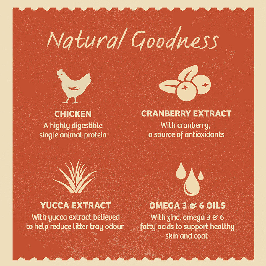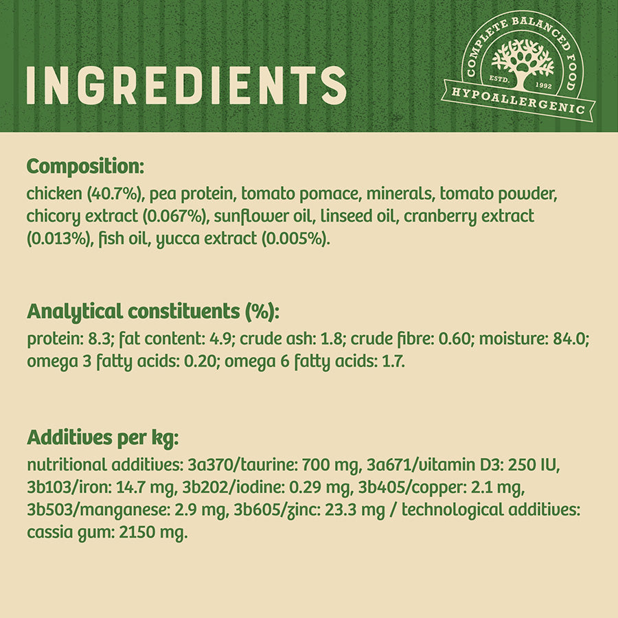Chicken (40.7%), pea protein, tomato pomace, minerals, tomato powder, chicory extract (0.067%), sunflower oil, linseed oil, cranberry extract (0.013%), fish oil, yucca extract (0.005%)
