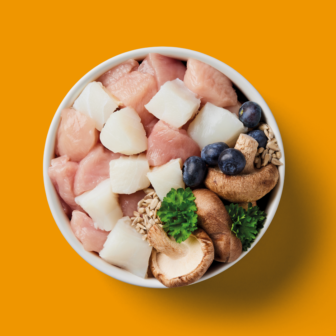White Fish (Haddock, Pollock), Organic Chicken with bone, Organic Chicken heart and liver, Shiitake mushrooms, Blueberries, Parsley, Salmon Oil, Spirulina, Sunflower seeds, Turmeric