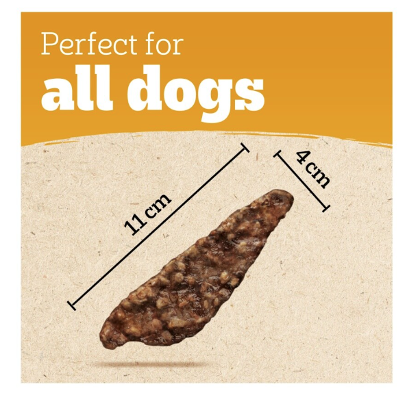 Feeding instructions: Small dogs e.g. Dachshund, feed up to ½ treats per day. Medium dogs e.g. Cocker Spaniel, feed up to 1 treat per day. Large dogs e.g. Labrador, feed up to 2 treats per day. Please reduce main meal accordingly.Fresh drinking water should always be available.