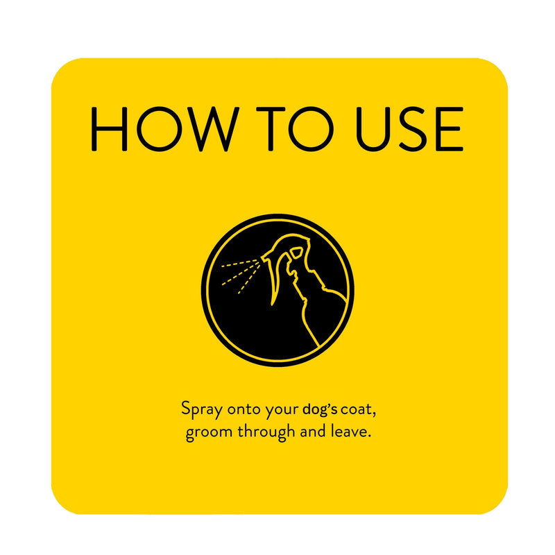 Spray onto your dog’s coat, groom through and leave. Avoid contact with eyes. If this occurs rinse with water. Keep out of reach of children.