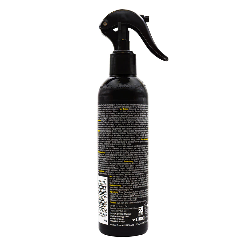 Pre-Wash Fox Poo, by Animology, is a unique pre-wash spray specifically designed to help initiate the breakdown and neutralisation of unpleasant odours caused by your dog's encounters with faeces, dead fish, and other repugnant substances.