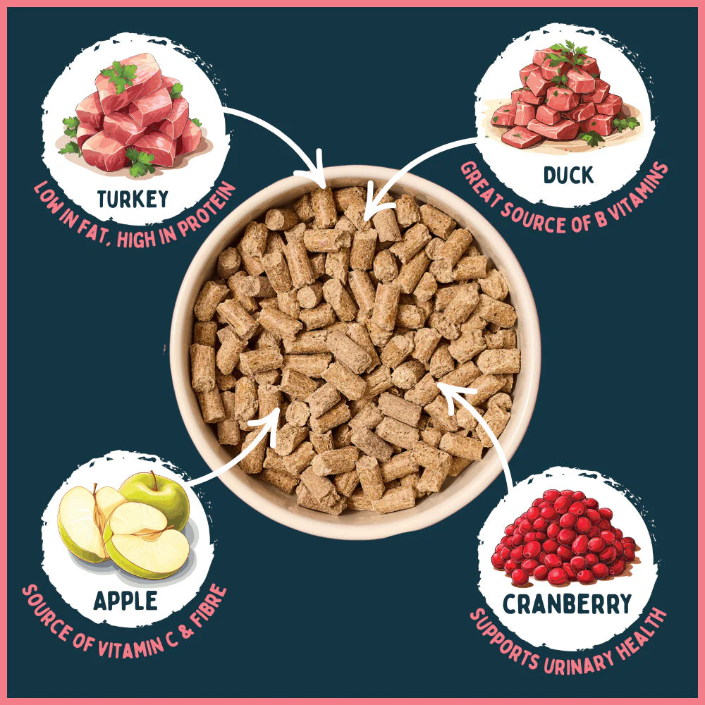 For when one meat just isn't enough. Our award winning Turkey and Duck Cold Pressed recipe is specially blended using the best quality ingredients. Gently pressed with turkey, which is low in fat and high in protein, duck for vitamin B, fibre rich apple, and cranberry to support good urinary health.