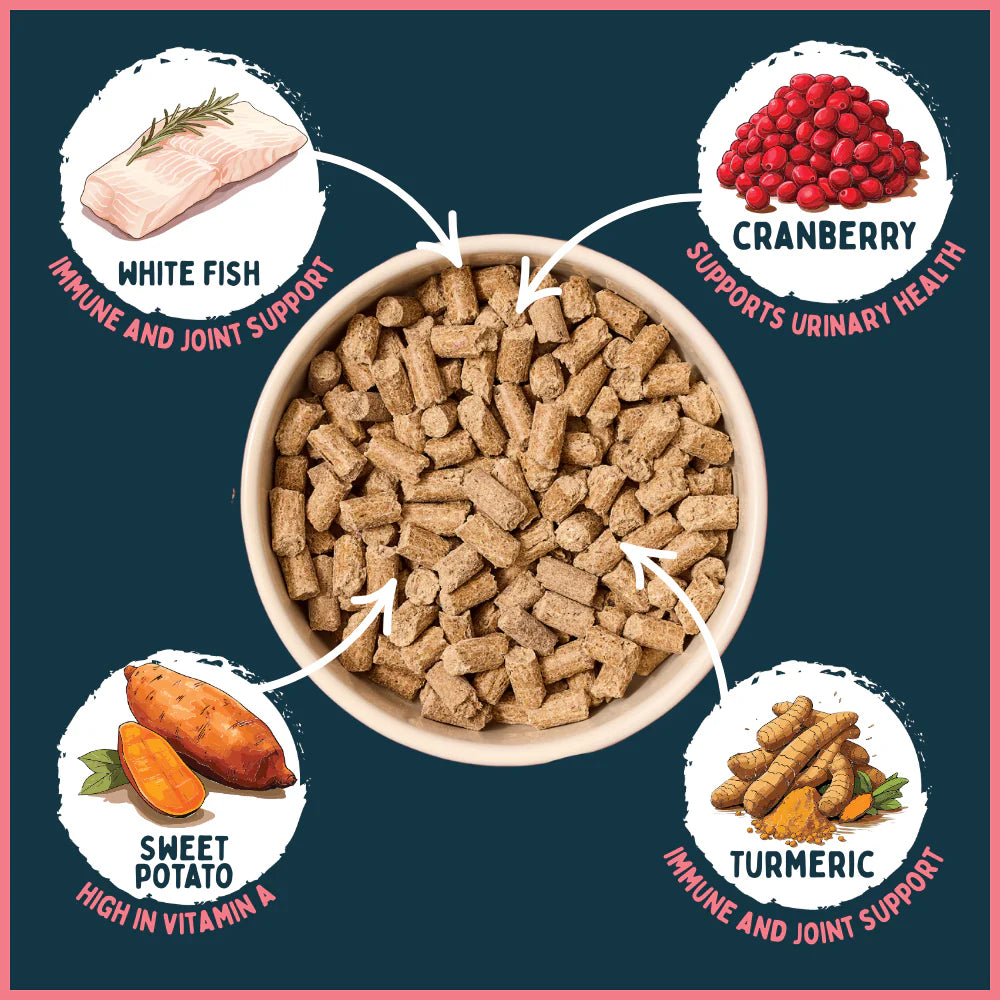 Tell your dog’s allergies to go fish. Our award winning White Fish recipe is free from pea, grain and chicken. Naturally rich in omega-3 and blended with sweet potato, which is high in vitamin A, green lipped mussel as a natural anti-inflammatory and seaweed which is rich in antioxidants.