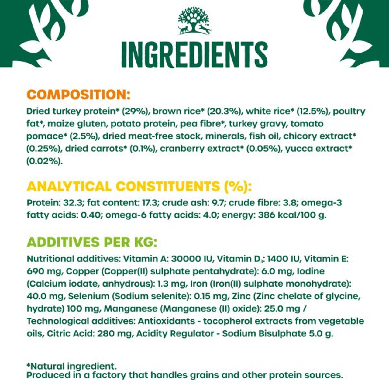 dried turkey protein* (29%), brown rice* (20.3%), white rice* (12.5%), poultry fat*, maize gluten, potato protein, pea fibre*, turkey gravy, tomato pomace* (2.5%), dried meat-free stock, minerals, fish oil, chicory extract* (0.25%), dried carrots* (0.1%), cranberry extract* (0.05%), yucca extract* (0.02%). *Natural ingredient.