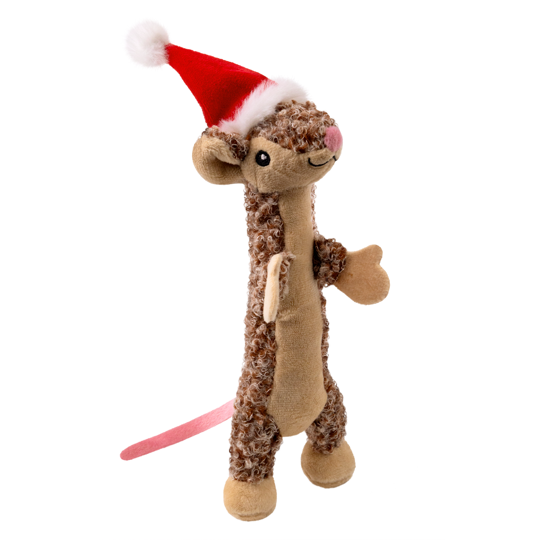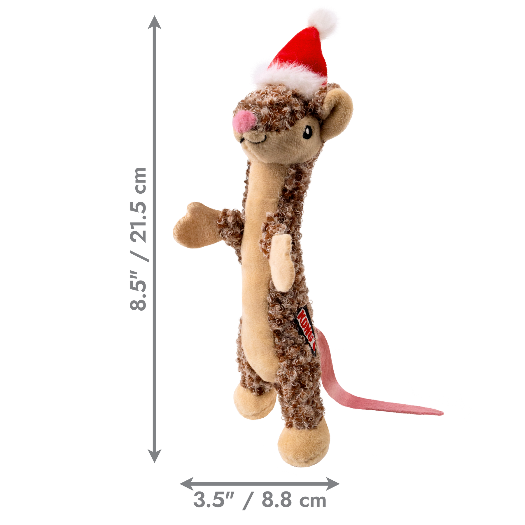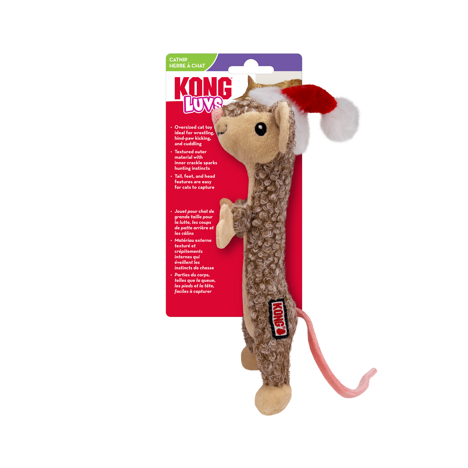 KONG Holiday Cat Luvs Mouse is ready for rounds of active play with your cat! This oversized cat toy is ideal for full-body play sessions, with uniquely textured outer material and an inner crackle that sparks wrestling and hind paw kicking. Easy-to-capture features like its head, feet, and tail make this mouse an ideal contender. KONG Premium North American Catnip inside keeps cats coming back for energetic rounds of solo play. When your cat is tired from all the action, the Luvs Mouse becomes the perfect snuggle.