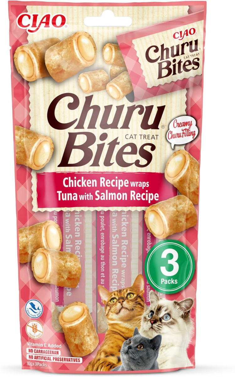 TWICE THE TEXTURE: Each pillow-shaped bite starts with a soft baked chicken paste with no grains, preservatives, carrageenan or artificial colours. Then we've filled the centres with Inaba's delicious Churu filling to give your cat twice the texture
