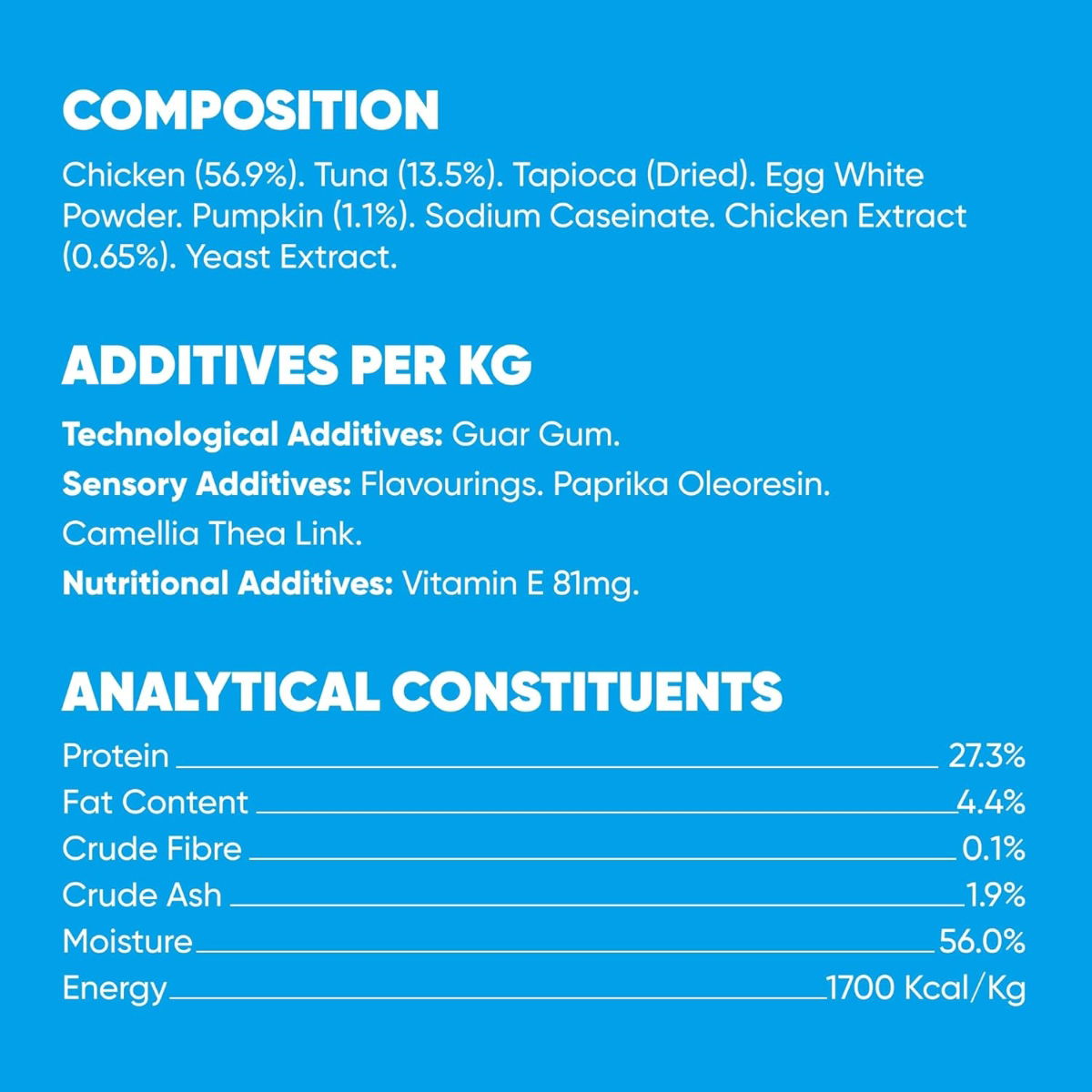 Chicken (56.9%), Tuna (13.5%), Tapioca (Dried), Egg White Powder, Sodium Caseinate, Chicken Extract (0.65%), Yeast Extract.