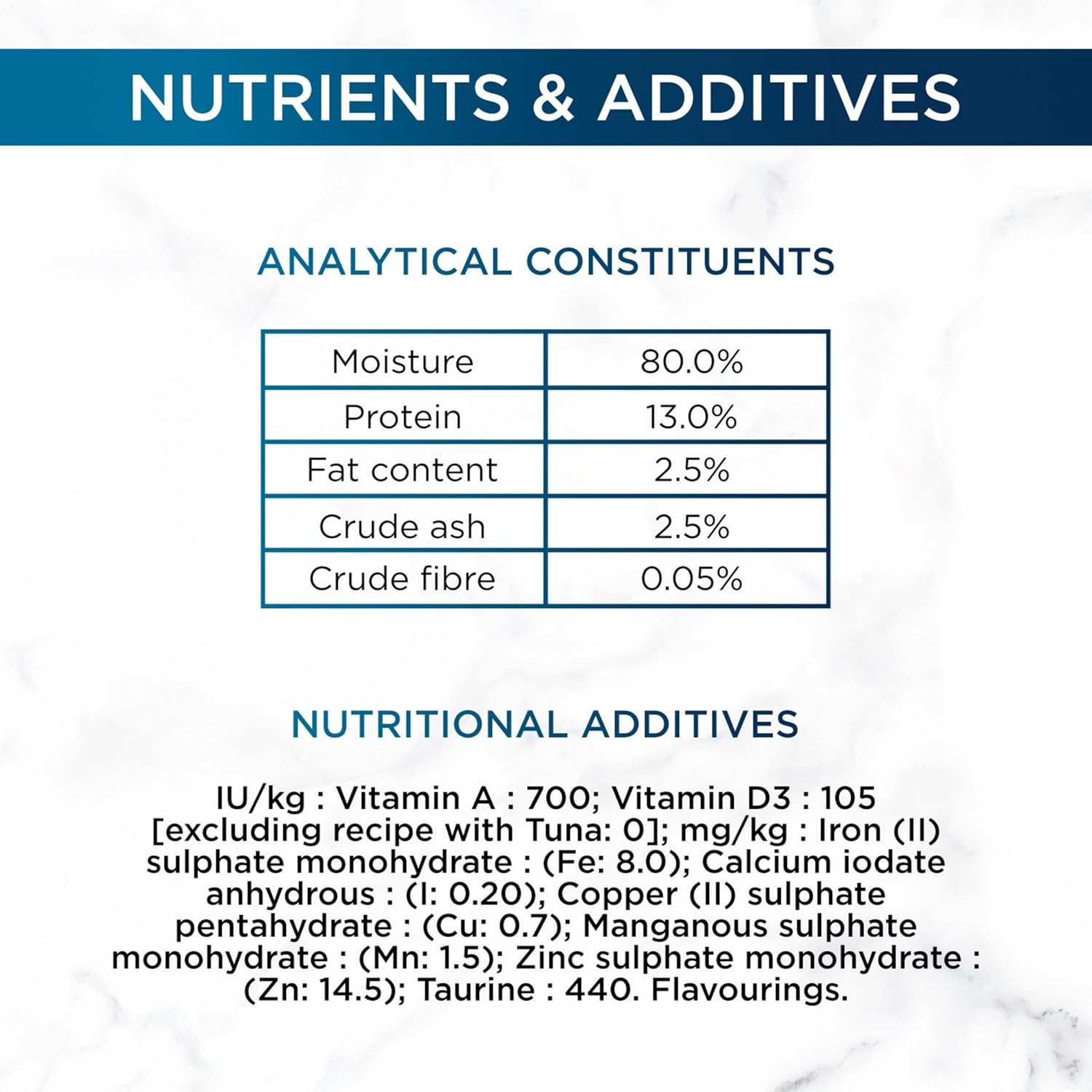 Tuna: Meat and animal derivatives, vegetable protein extracts, fish and fish derivatives (tuna 4%), minerals, various sugars.