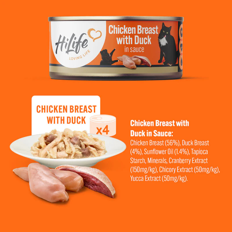 Chicken with Duck in Sauce: Chicken breast (56%), duck breast (4%), sunflower oil (1.4%), tapioca starch, minerals, cranberry extract (150mg/kg), chicory extract (50mg/kg), yucca extract (50mg/kg).
