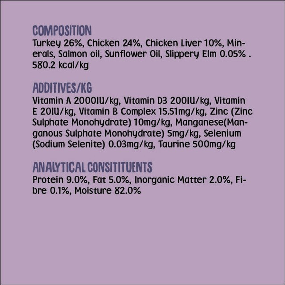 Complete and naturally grain free, our turkey in jelly recipe is packed with up to 60% meat, free from colours, preservatives and added sugars or salts. Including prebiotic slippery elm for digestive health.