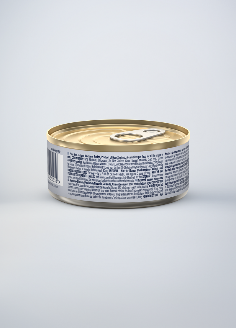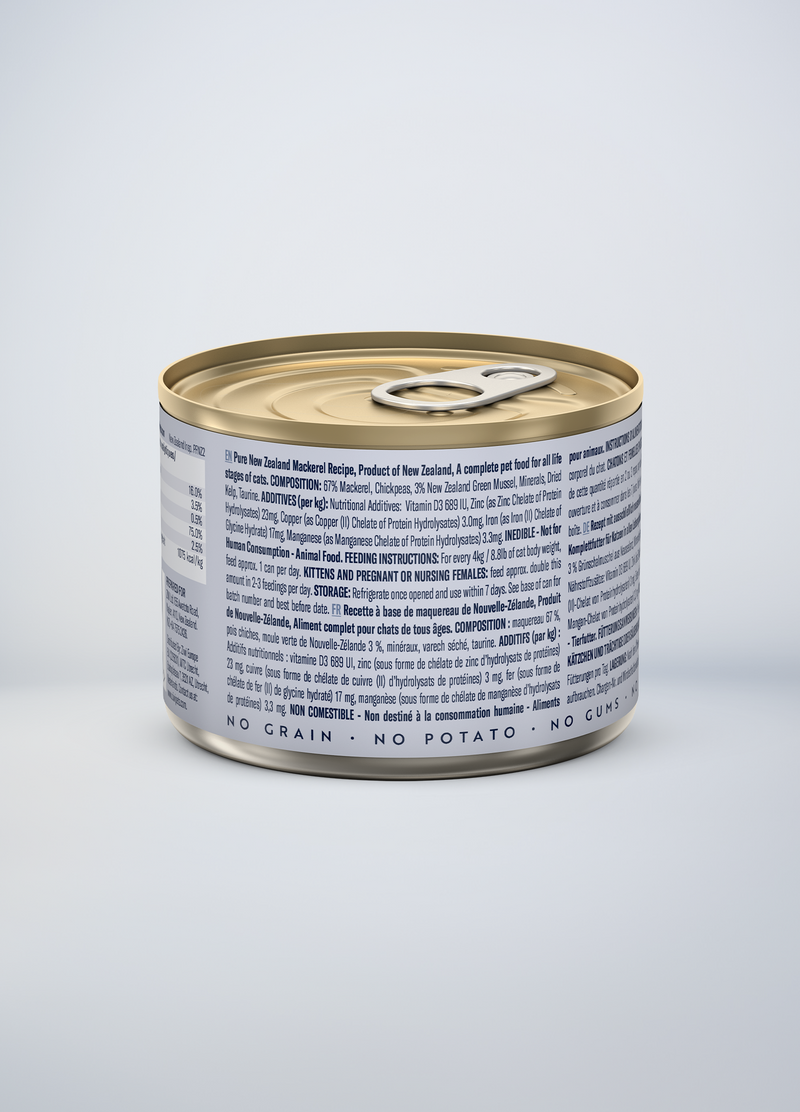 Mackerel, Water Sufficient for Processing, Chickpeas, New Zealand Green Mussel, DL-Methionine, Minerals (Dipotassium Phosphate, Magnesium Sulfate, Zinc Amino Acid Complex, Manganese Amino Acid Complex, Copper Amino Acid Complex), Dried Kelp, Vitamins (Choline Chloride, Vitamin E Supplement, Thiamine Mononitrate, Niacin, Pyridoxine Hydrochloride, Riboflavin, Vitamin D3 Supplement, Folic Acid), Salt, Taurine.