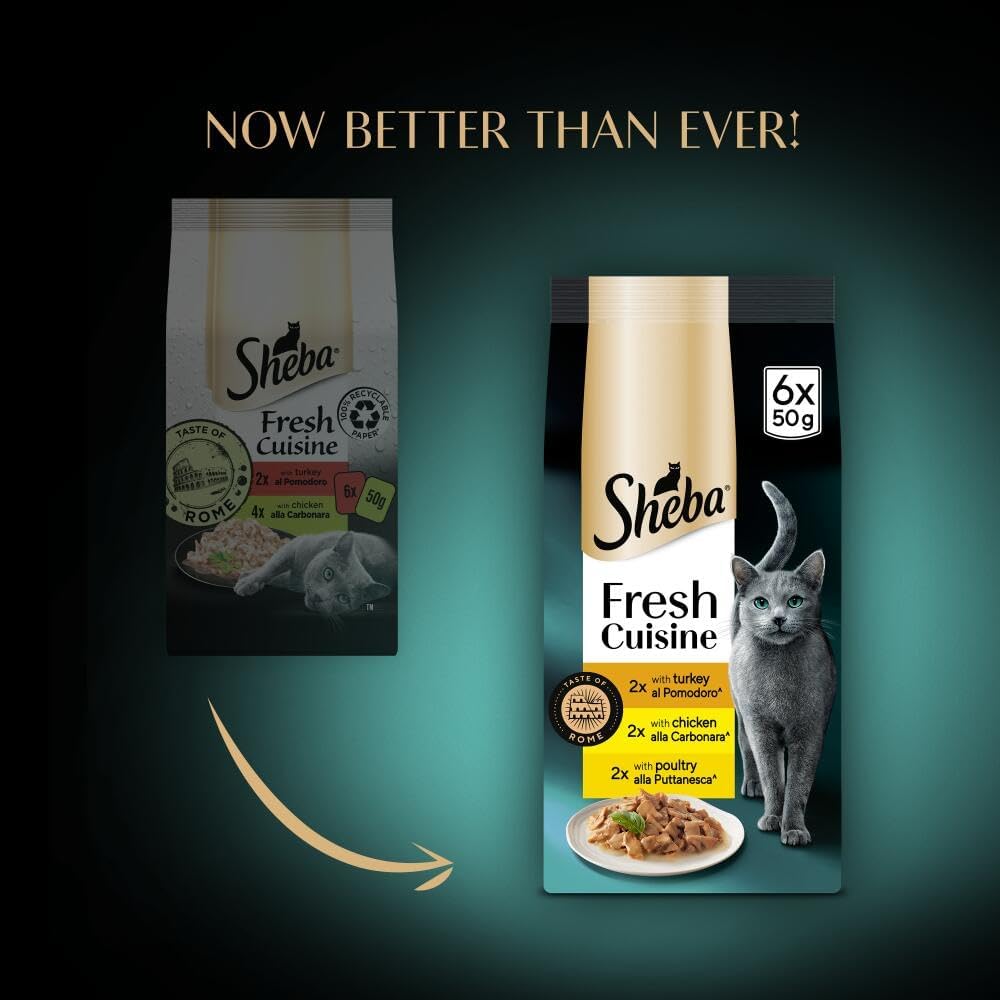 With the SHEBA Fresh & Fine cat food range it's easy to give your cat the tastes they love with a fine combination of delicate pieces providing complete nutrition for your feline companion. Made from select ingredients with no artificial colours or preservatives, a wonderful way to bring you and your feline friend closer at mealtimes. Available in 50g cat food pouches. Suitable for all cats over 12 months adult and senior.