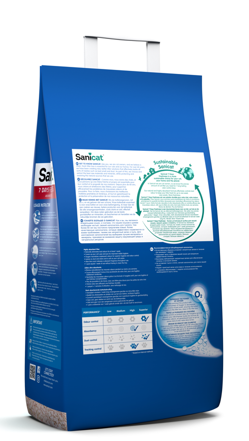 Sanicat 7 Days is a light-weight absorbent cat litter in a single-dose pack that ensures freshness and no maintenance for up to 7 days. Enriched with oxygen to neutralise unpleasant odours. Aloe Vera scent releases pleasant fragrance throughout use. No dust and coarse granules reduce tracking and is soft on your cats paws. Packaging is high quality FSC certified paper and 100% recyclable.