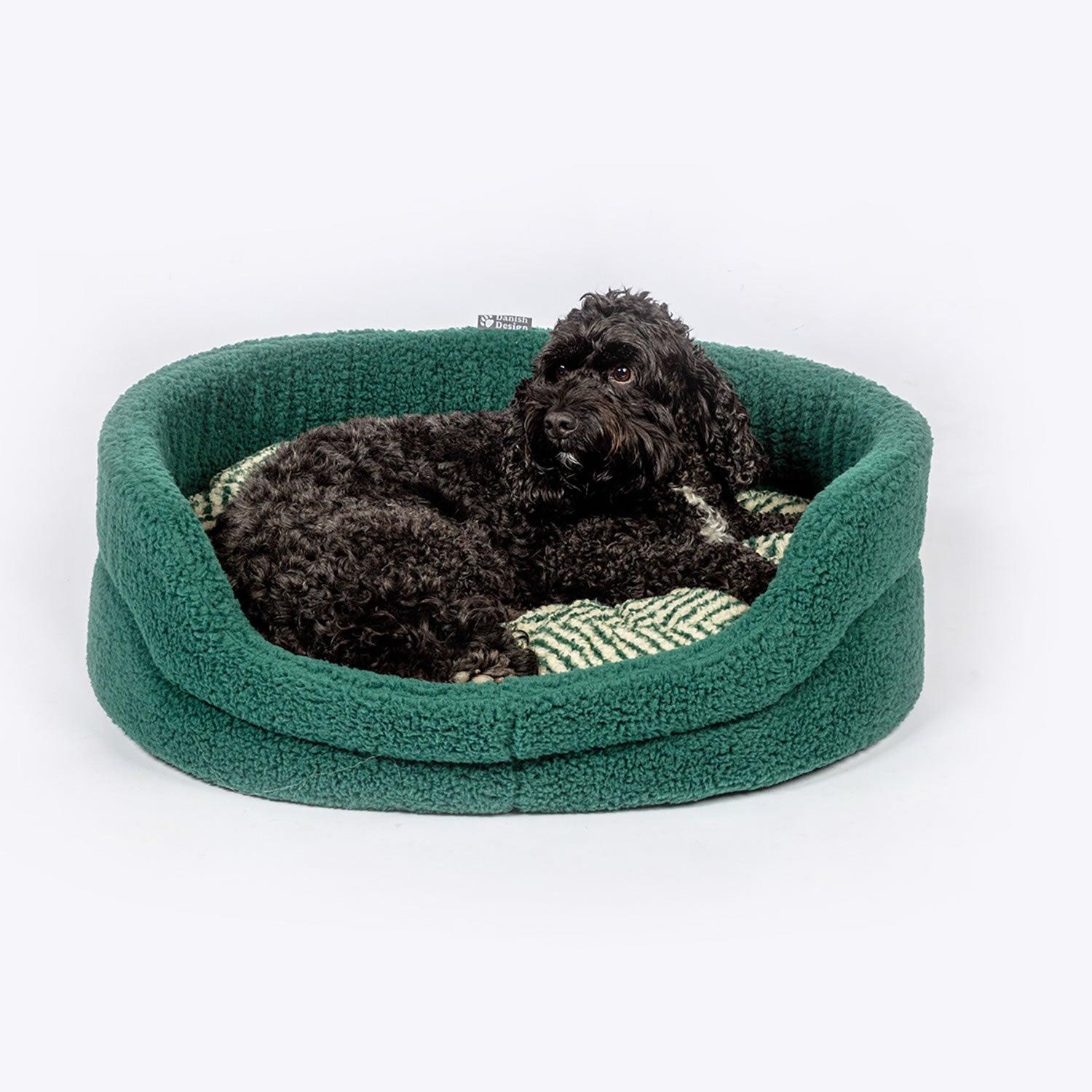 Made with soft knitted fleece fabrics for superior warmth and comfort, the slumber beds are a traditionally shaped basket bed which in three sizes, accommodate a range of pets. Each bed has a luxury mattress filled with supersoft polyester fibre, which is removable. Slumber beds are made with Ecoflex, an innovative polyester filling which is hypoallergenic, chemical free and flame resistant. The filling is also made with a majority of recycled fibres and features an 'S' shaped structure for enhanced recovery. This characteristic green herringbone design, features forest green and beige colours.