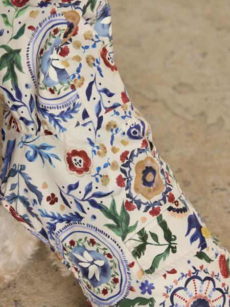 This charming painterly block print features bold blooms and winding vines in a fun and vibrant colour palette. Our pack away water-resistant dog jackets are designed for durability and convenience. Featuring zip and popper fastenings for easy access, they’re also machine washable for hassle-free cleaning. Available in three sizes, they fit most dogs, with adjustable velcro to ensure the perfect fit