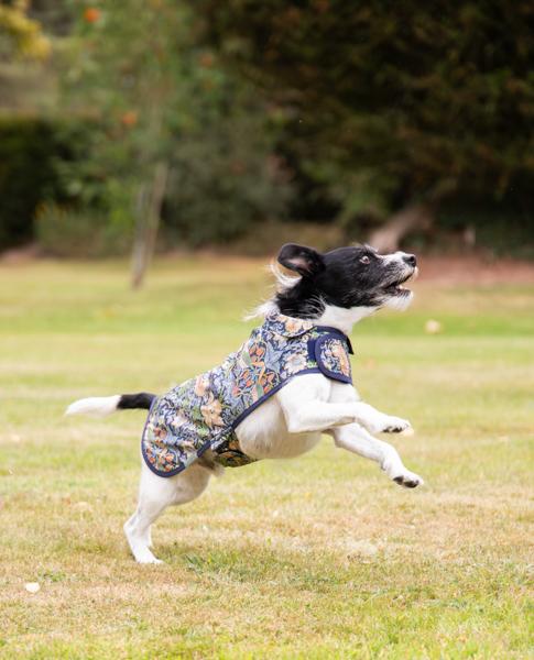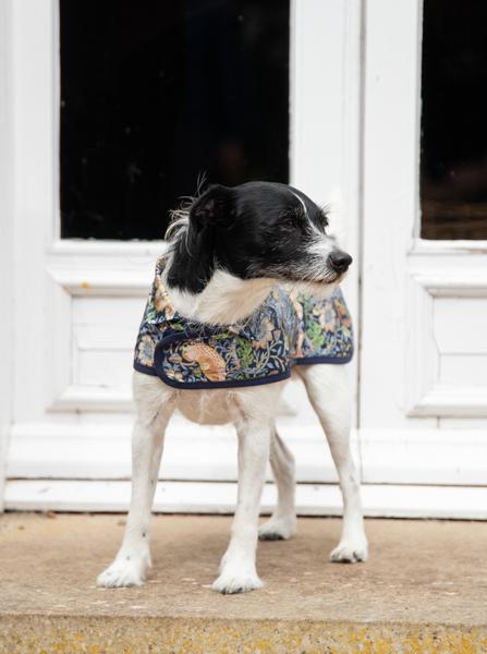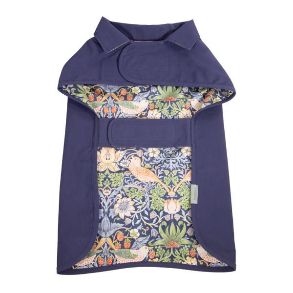 From the Morris & Co pet collection, this reversible dog coat pairs timeless style with everyday practicality. One side features the iconic Strawberry Thief print, while the other offers a classic plain navy with a printed collar detail. Crafted from lightweight, water-resistant fabric, it ensures comfort in all weathers, with an adjustable Velcro fastening and back opening for easy leash access.