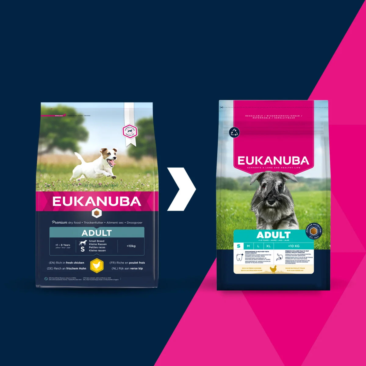 This EUKANUBA dry food for adult dogs, rich in fresh chicken, is 100% complete and balanced and perfect for small breeds aged from 1 to 8 years.