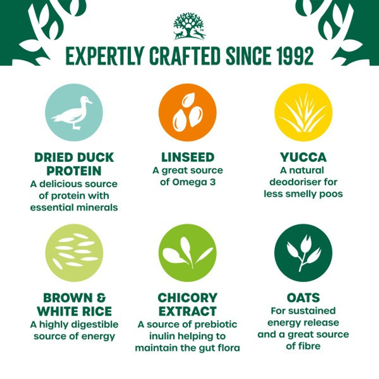 Crafted with a handful of nature's nourishing ingredients and combined with flavourful duck to create highly digestible, tasty dry dog food. Our recipes support digestion, immunity and promote healthy skin & coat. You can be sure that your dog is enjoying a balanced diet. One that not only tastes good but does them a world of good too.