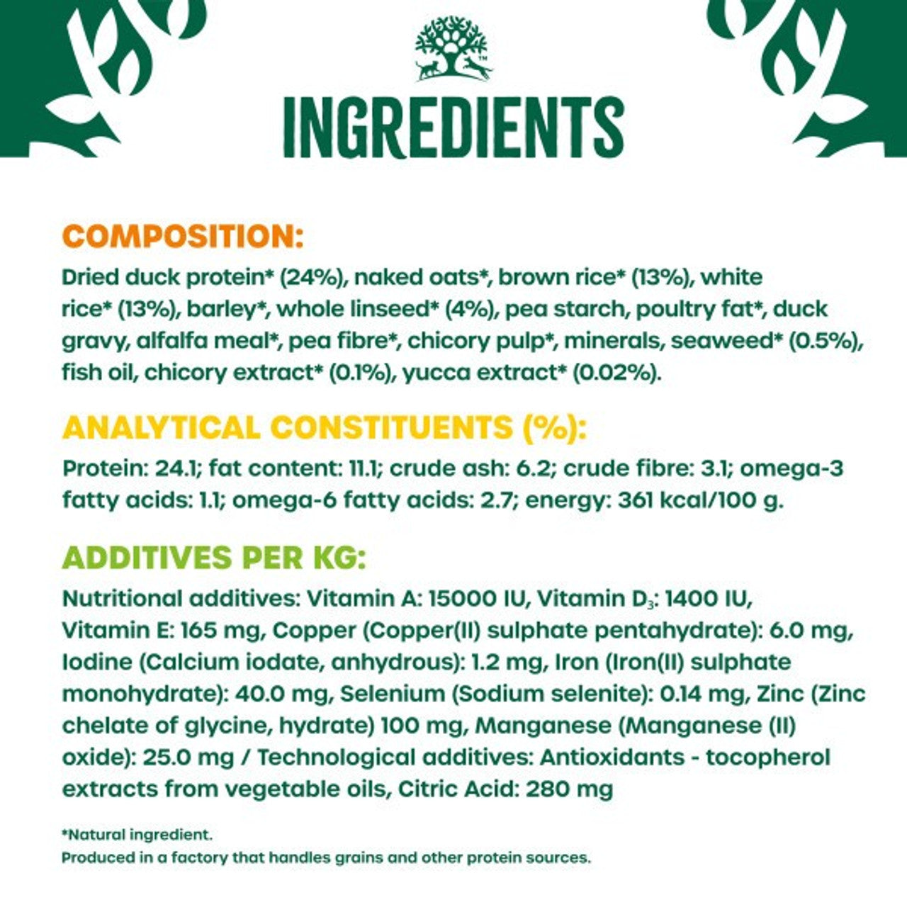Composition: dried duck protein* (24%), naked oats*, brown rice* (13%), white rice* (13%), barley*, whole linseed* (4%), pea starch, poultry fat*, duck gravy, alfalfa meal*, pea fibre*, chicory pulp*, minerals, seaweed* (0.5%), fish oil, chicory extract* (0.1%), yucca extract* (0.02%). *Natural ingredient.