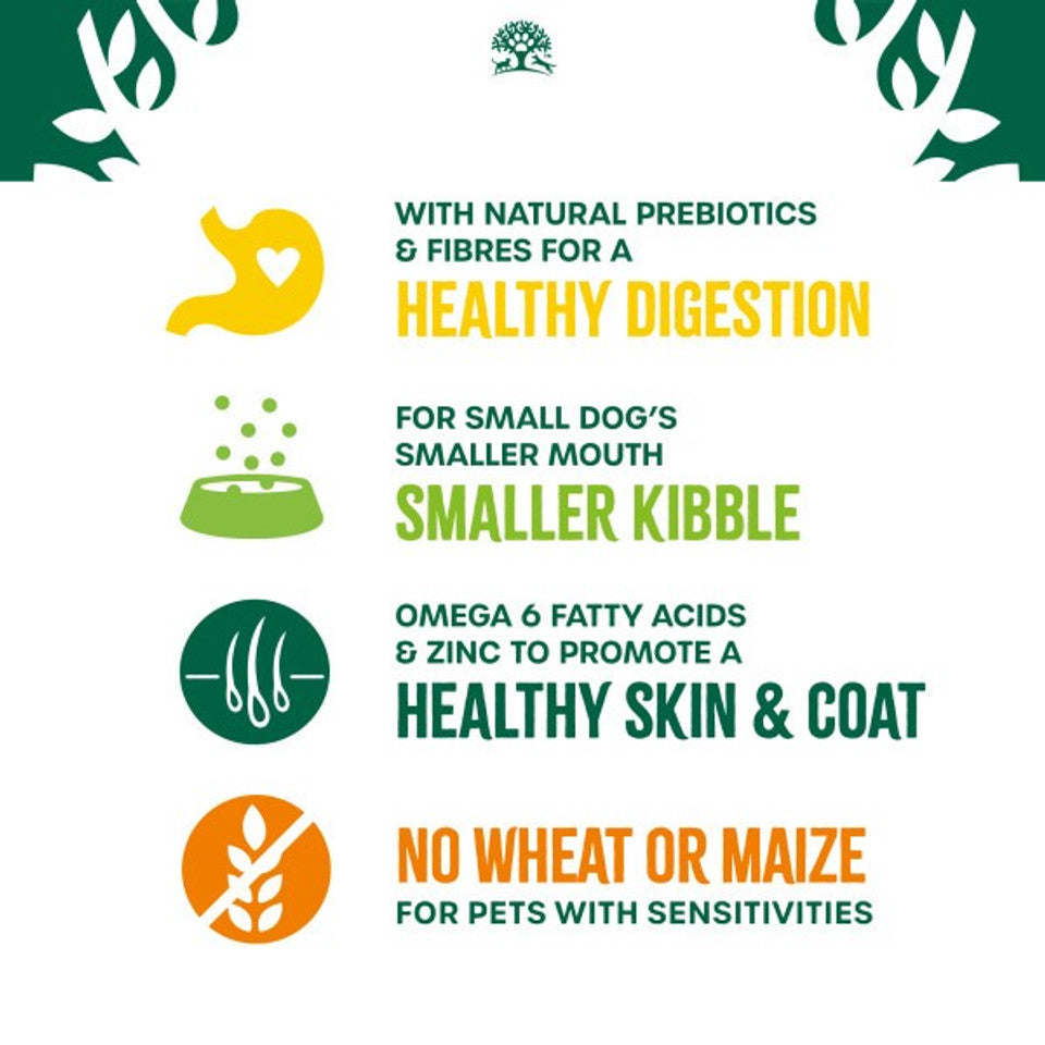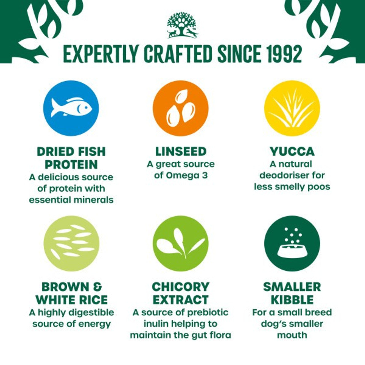 Crafted with a handful of nature's nourishing ingredients and combined with sustainably sourced fish to create highly digestible, tasty dry dog food. Our recipes include ingredients to support digestion, immunity and promote healthy skin & coat, while our smaller kibble size is optimised to suit your small breed dog's mouth.