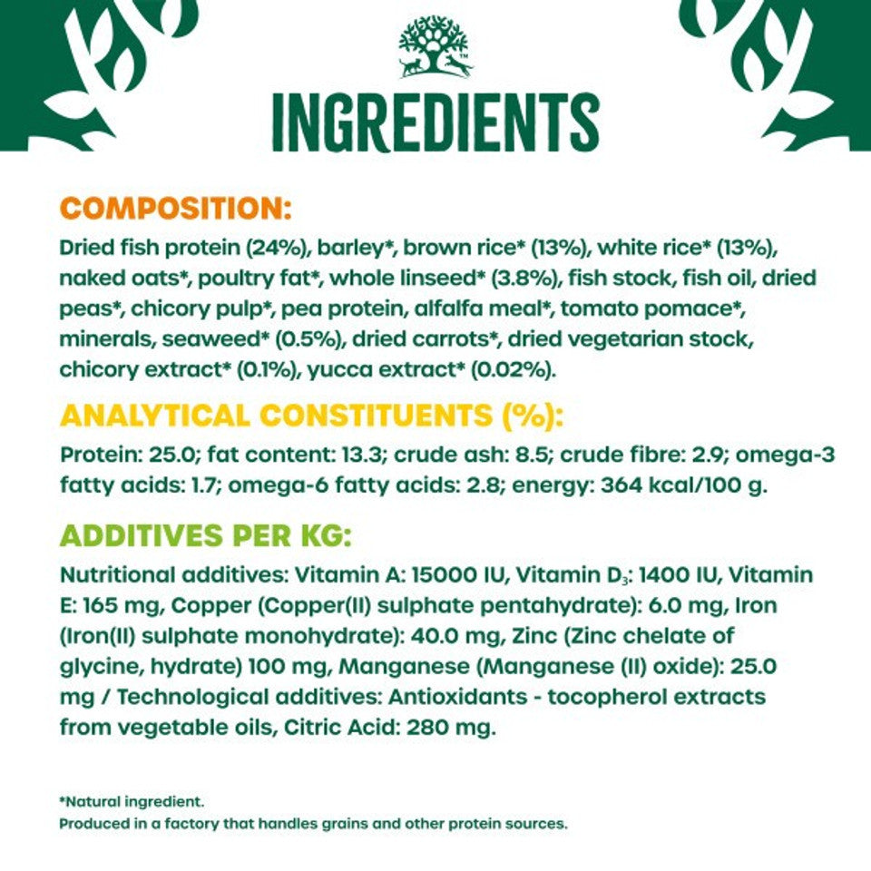 dried fish protein (24%), barley*, brown rice* (13%), white rice* (13%), naked oats*, poultry fat*, whole linseed* (3.8%), fish stock, fish oil, dried peas*, chicory pulp*, pea protein, alfalfa meal*, tomato pomace*, minerals, seaweed* (0.5%), dried carrots*, dried vegetarian stock, chicory extract* (0.1%), yucca extract* (0.02%). *Natural ingredient.
