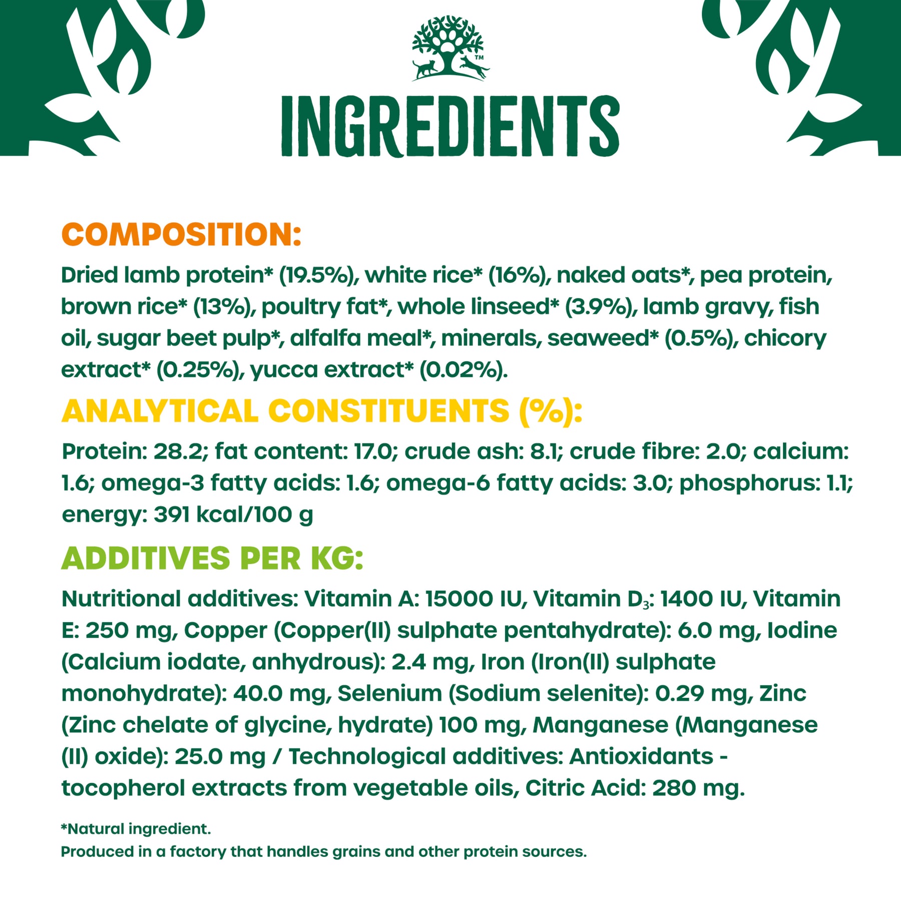 dried lamb protein* (19.5%), white rice* (16%), naked oats*, pea protein, brown rice* (13%), poultry fat*, whole linseed* (3.9%), lamb gravy, fish oil, sugar beet pulp*, alfalfa meal*, minerals, seaweed* (0.5%), chicory extract* (0.25%), yucca extract* (0.02%). *Natural ingredient.