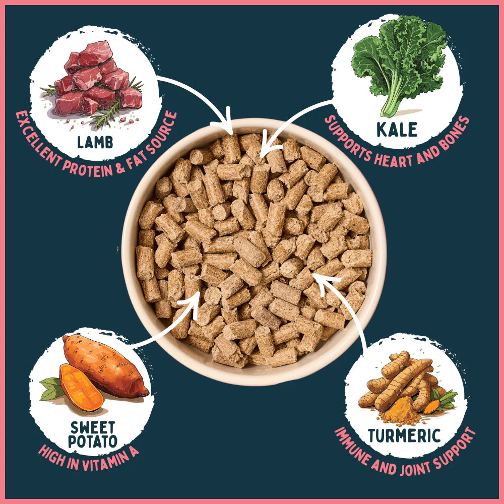 A baaa-rilliant award winning cold pressed blend with lamb, sweet potato, turmeric and cranberry. A recipe created by our world-renowned nutritionist to provide vitamin A, support urinary health and protect your dog’s joints.