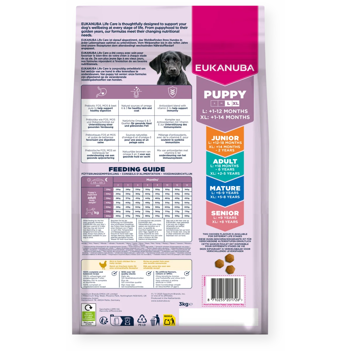 EUKANUBA Life Care offers science-backed premium nutrition, designed to meet the changing needs of dogs through every stage of life. Specially formulated for large-breed puppies aged 1 to 12 months (or 1 to 14 months for giant breeds), this 100% complete and balanced dry food is rich in fresh chicken and features carefully selected ingredients to provide tailored nutrition for optimal growth and development. Containing DHA, this recipe supports learning and trainability during your puppy's early stages, while calcium is favourable for developing strong bones and a healthy skeletal structure. The antioxidant blend with vitamin E helps support immunity, ensuring your puppy's natural defenses stay strong. The tailored fibre blend of prebiotic FOS, MOS, and beet pulp promotes healthy digestion, while natural sources of omega-6 and omega-3 support healthy skin and a shiny coat. This dry food provides advanced nutrition for large-breed puppies, supporting optimal body condition and lifelong wellbeing. Trust EUKANUBA to nurture your dog's foundation for a happy and healthy life.