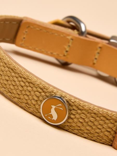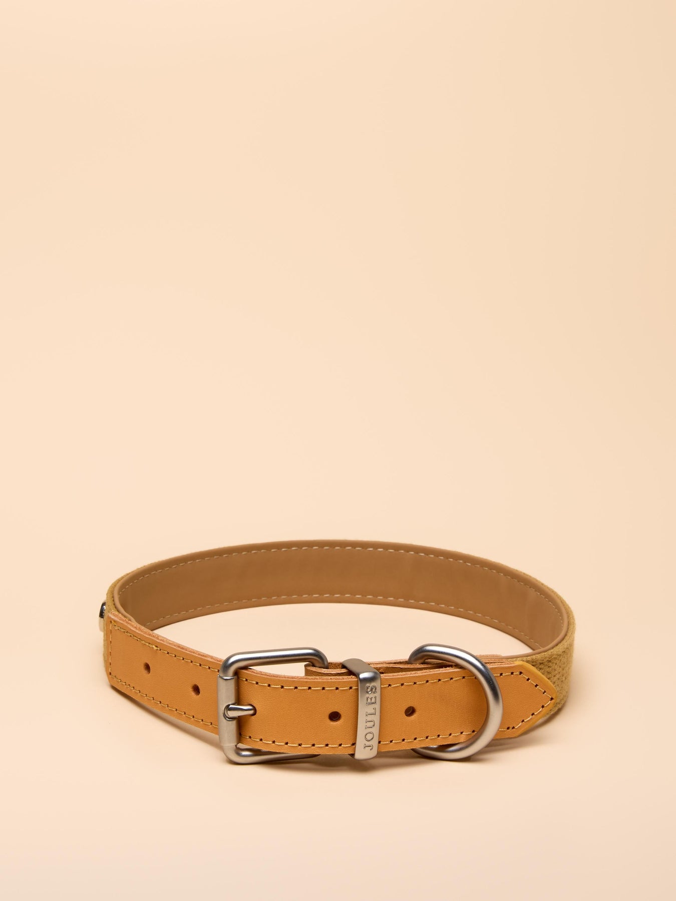 Crafted from built-to-last leather and webbing this comfortable dog collar is finished with our usual attention to detail. Durable and dapper, it will make sure your four-legged friend can approach every day in style. The brushed metal buckle adds a premium touch as does the webbing back.Available in three sizes Available in tan and khaki Matching lead available Premium metal hardware Crafted from durable leather Webbing detail