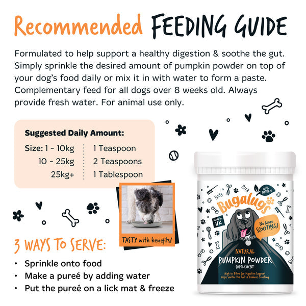 Bugalugs Pumpkin Powder is free from unnecessary fillers and additives. Packed with essential vitamins A, C, and E, along with vital minerals and powerful antioxidants, this supplement provides wellness benefits that go beyond digestion. From supporting healthy skin and a shiny coat to enhancing overall vitality, it’s the perfect addition to your pet’s daily diet.