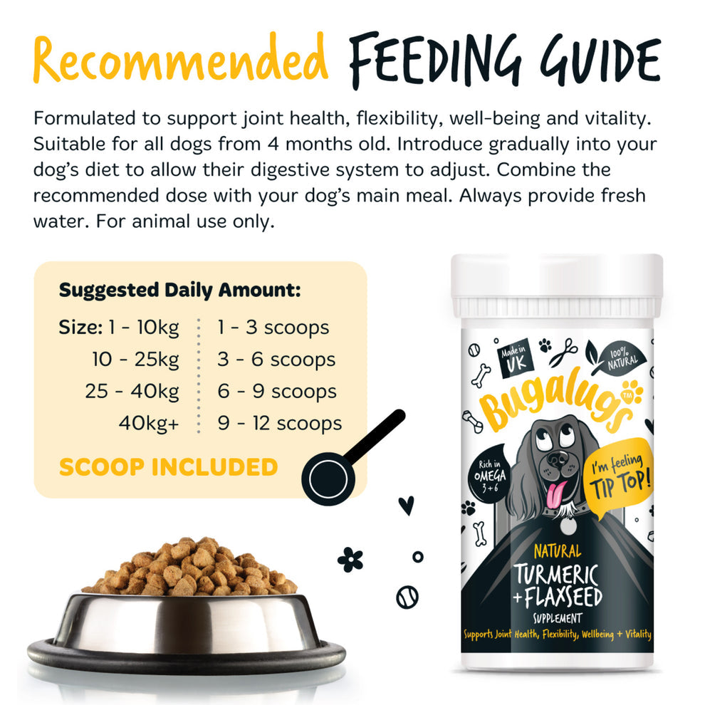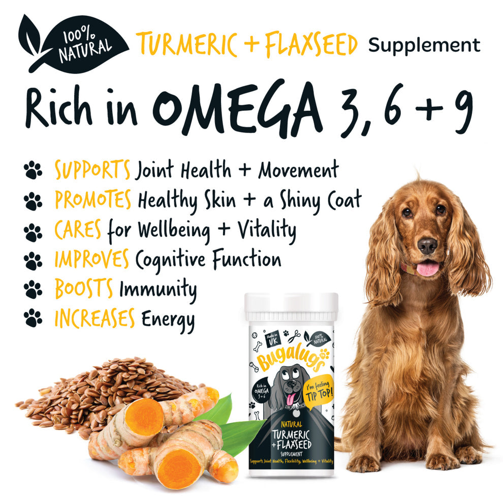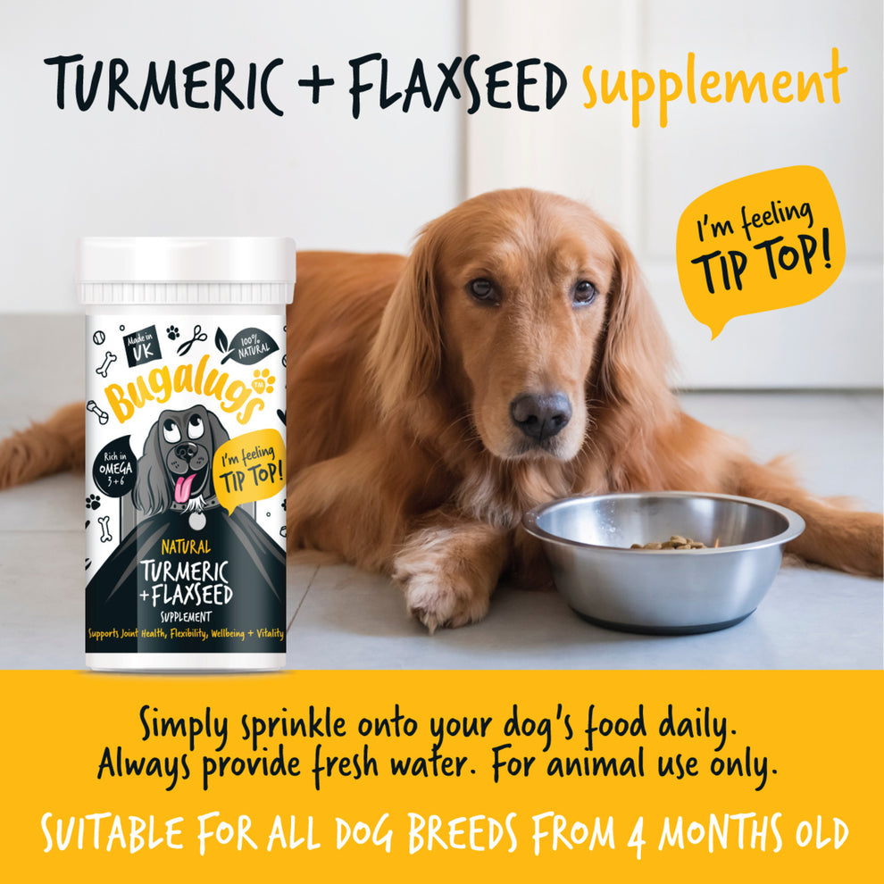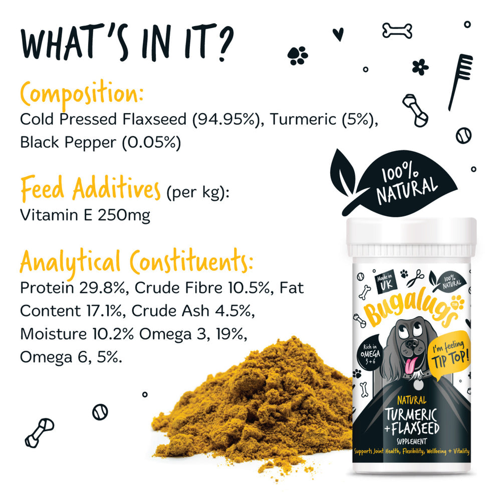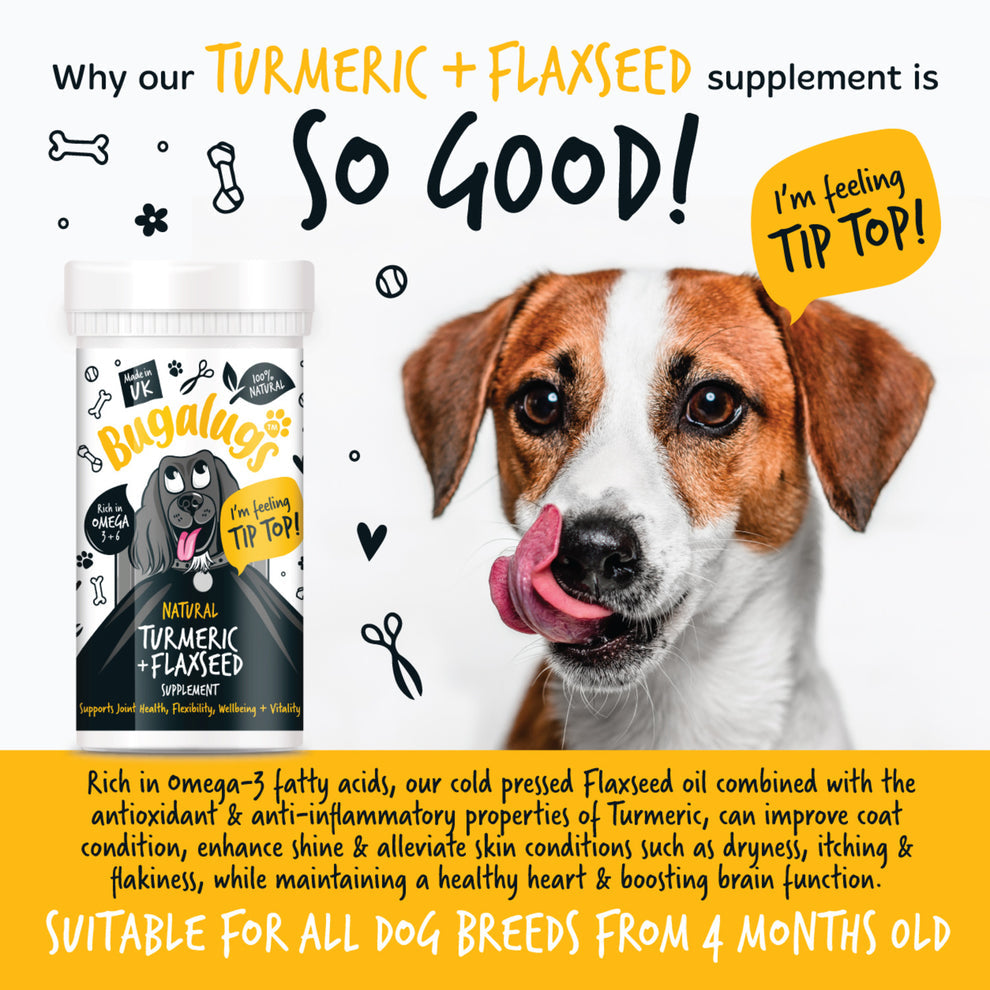 Bugalugs Natural Turmeric and Flaxseed Supplement is a premium blend formulated to support your dog’s joint health, flexibility, well-being, and vitality.