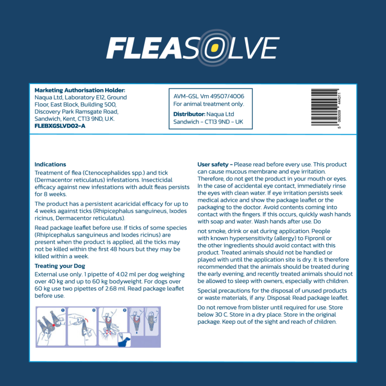 FleaSolve contains 402mg of Fipronil, offering a potent and fast-acting solution to combat Flea & Tick infestations.