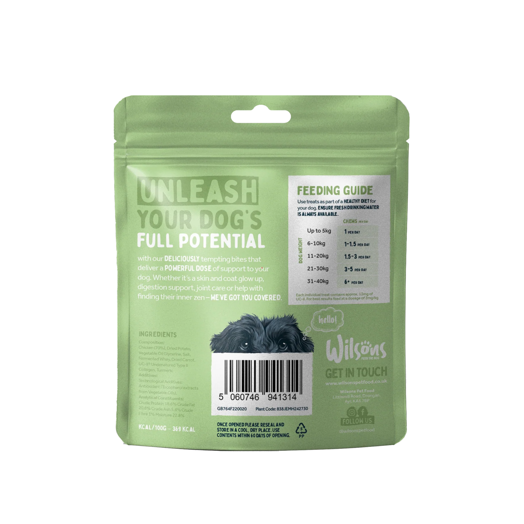 Help support free movement and on-point zoomies with our delicious joint support bites. Our clinically approved recipe is packed full of natural ingredients including a powerful dose of collagen and 70% chicken to provide targeted joint care for pups of all ages.