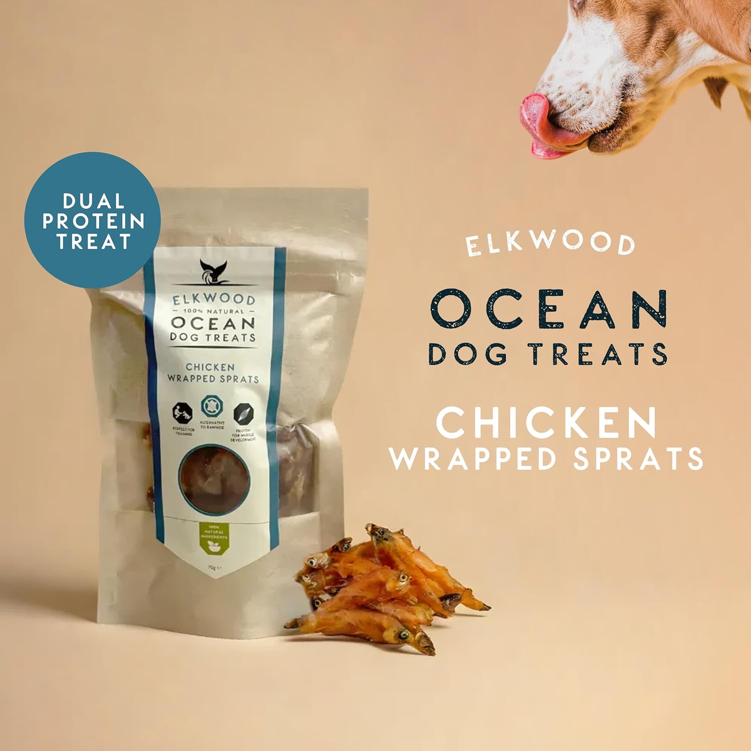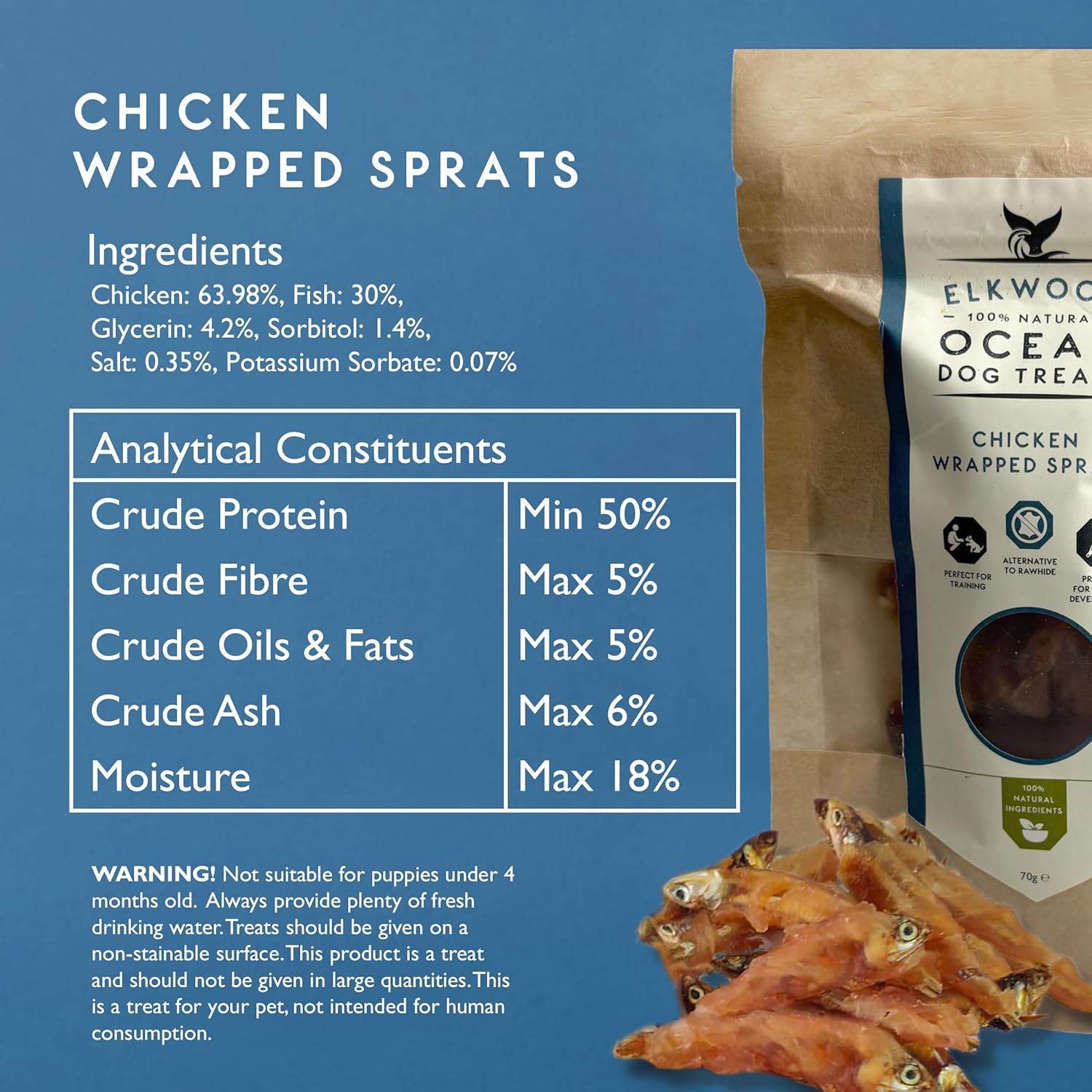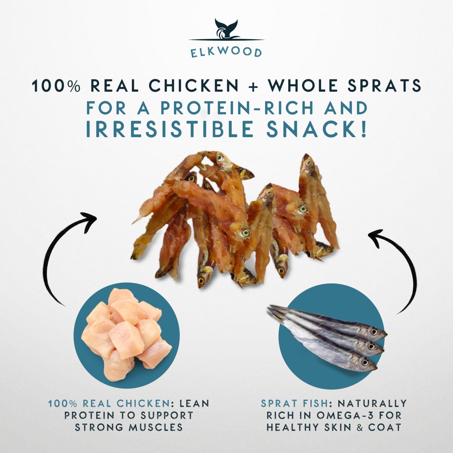 Elkwood 100% Chicken Wrapped Sprats are a natural and healthier treat for your dog. Made using 64% real chicken meat and 30% natural fish for added yumminess, they provides a rich source of protein, boosting muscle strength and growth and providing energy - perfect for dogs that love to run and play! Our natural treat range is a great alternative to standard rawhide or basic biscuit training treats. Perfect for training your dog, as a snack on the go, or an after dinner treat!