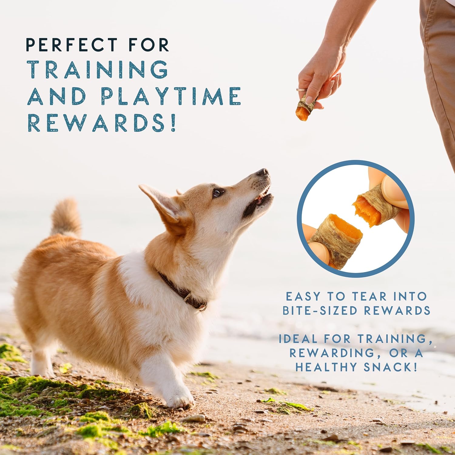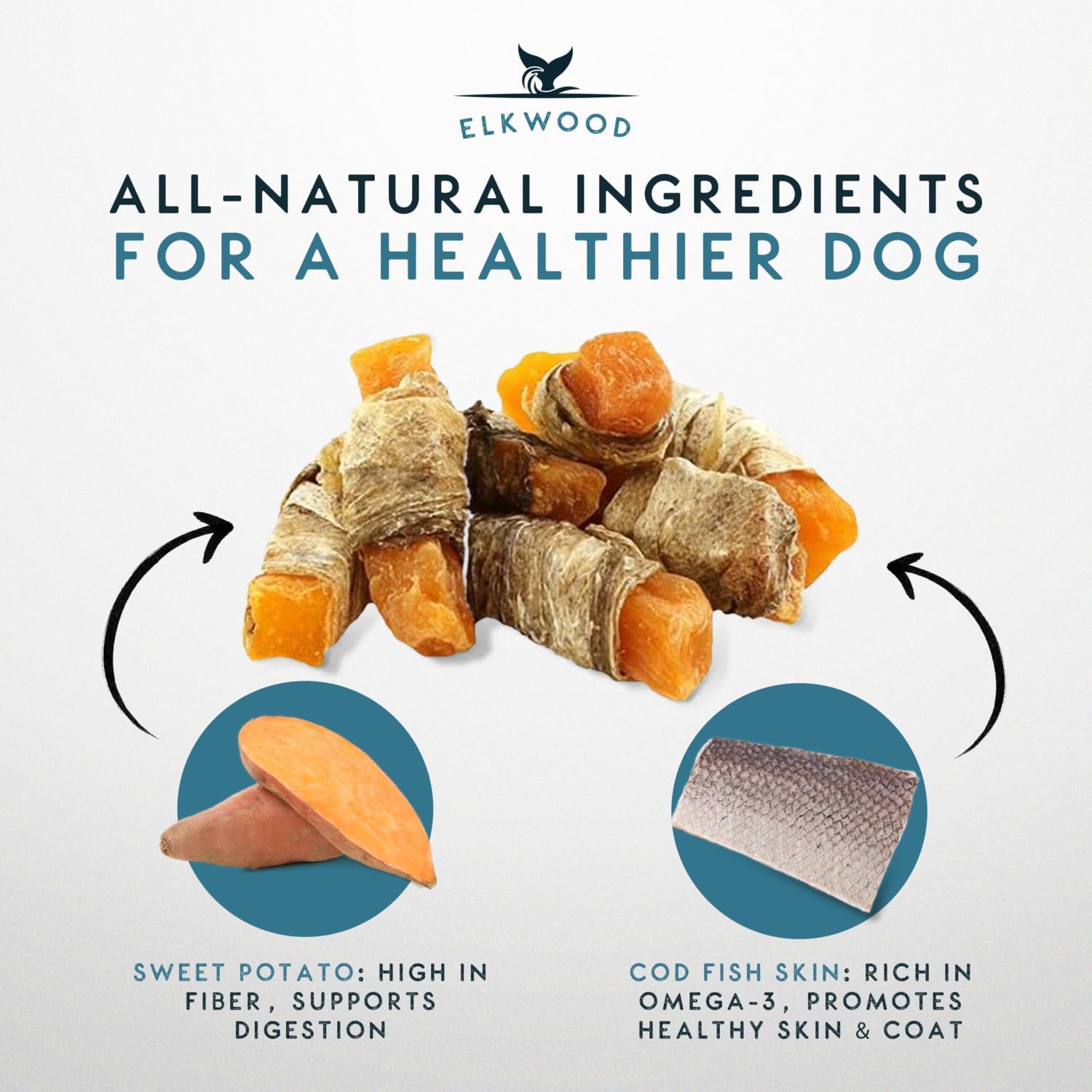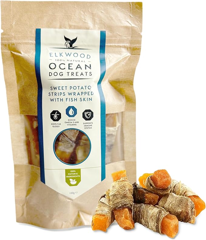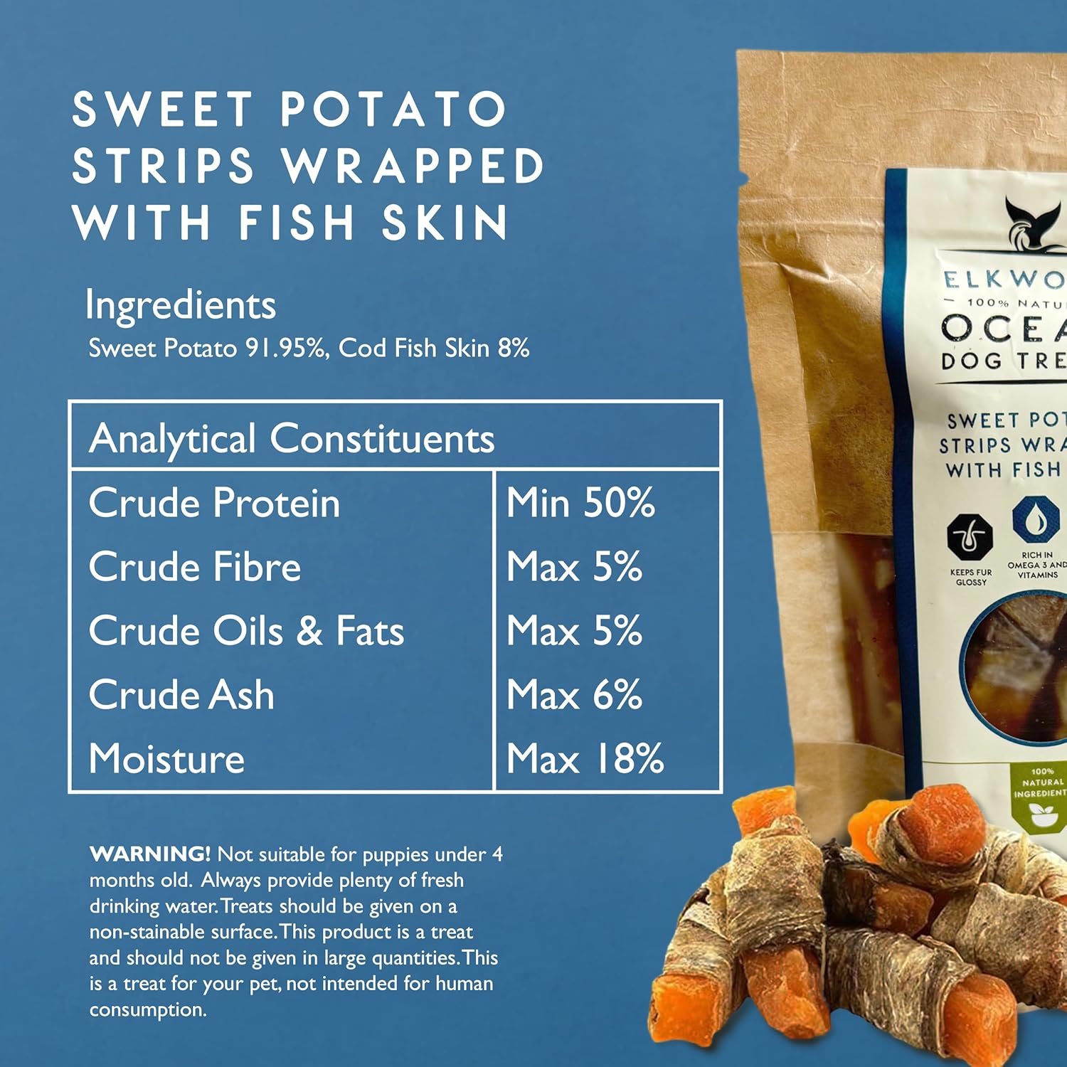 A natural healthier treat for your dog, our Sweet Potato Strips Wrapped with Fish Skin are low in fat and high in fibre to complement your pet's diet and support a healthy digestive system. Using only repsonsibly sourced fish and delicious sweet potatos these are naturally ow in fat and contain essential vitamins, B6, C, and A which support a healthy coat and skin. Fish skin is a delicious and healthy addition to your pet's diet. It contains protein and essential omega-3 fatty acids, nutrients that play a key role in cardiovascular health, cell repair, and supporting the immune system. Perfectly sized for a training your pups, on the go or an after dinner treat!