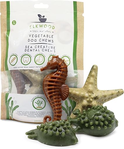 Our Under the Sea, Elkwood Sea Creature Shaped Dog Treats contain over 60% vegetables, 10% chicken and seaweed, they are also gluten free. They are easy to digest, low in fat whilst remaining delicious. Dental chews are a great way to help reduce plaque and clean your dog’s teeth with the grooved edges.