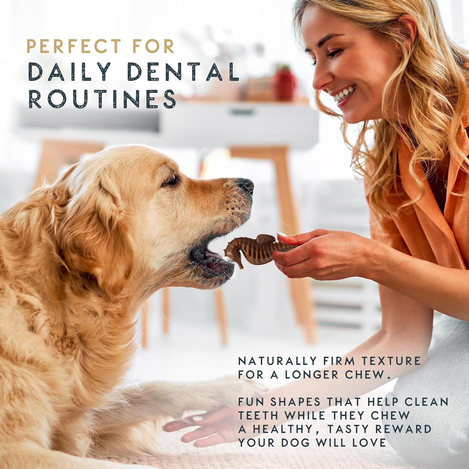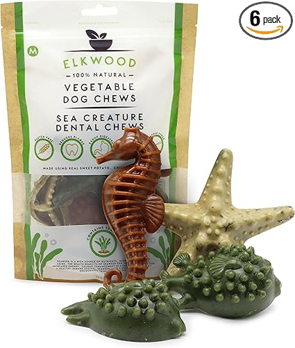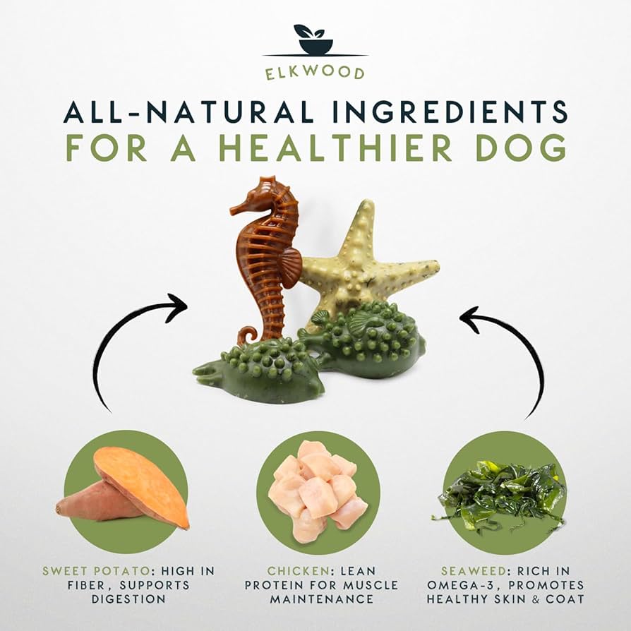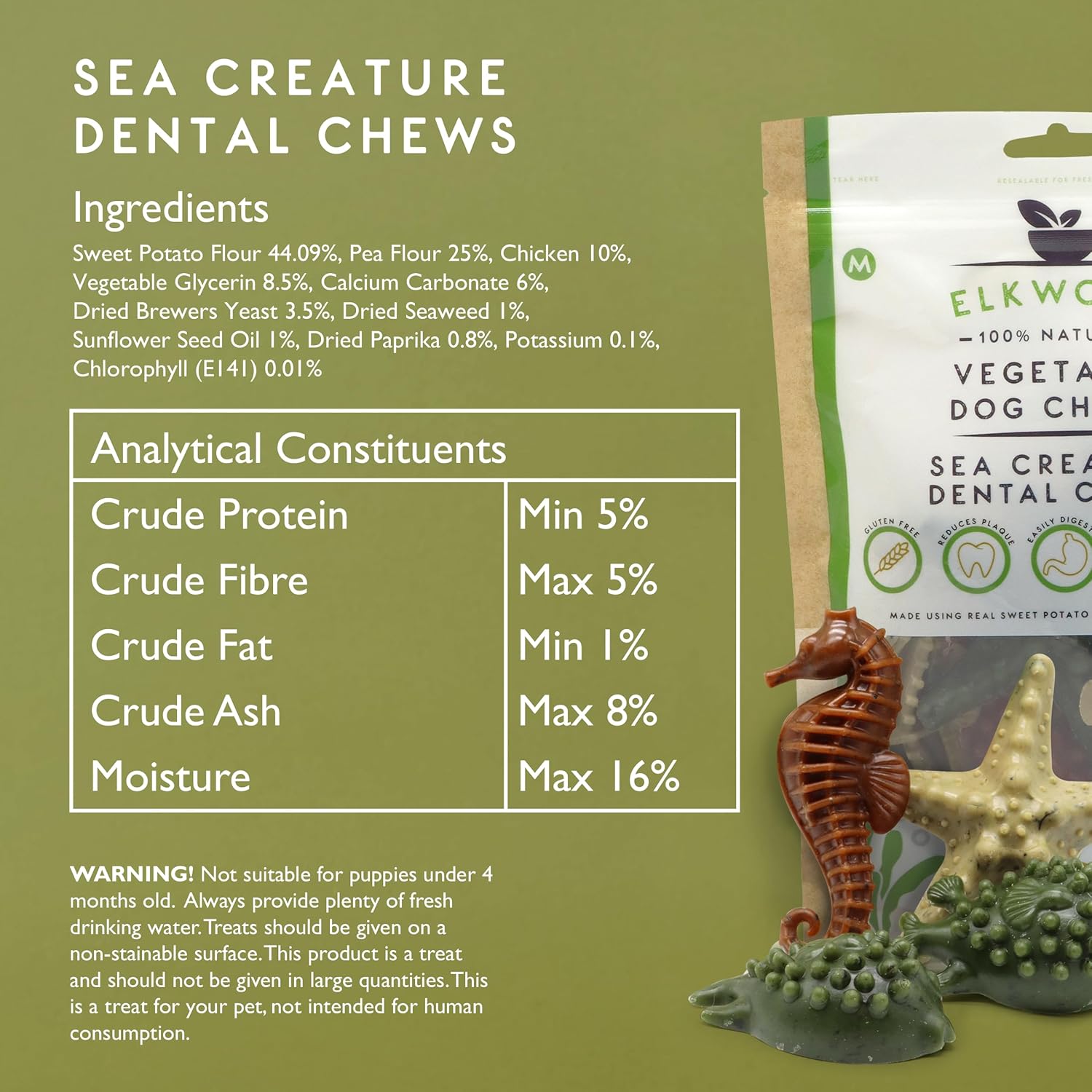 Our Under the Sea, Elkwood Sea Creature Shaped Dog Treats contain over 60% vegetables, 10% chicken and seaweed, they are also gluten free. They are easy to digest, low in fat whilst remaining delicious. Dental chews are a great way to help reduce plaque and clean your dog’s teeth with the grooved edges.