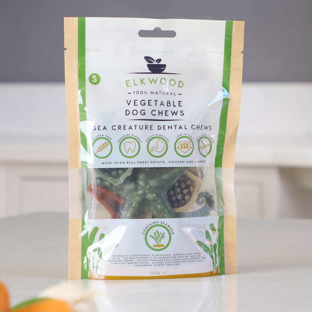 Our Under the Sea Elkwood Veggie Treats veggie formula uses sweet potato and pea flour which makes our treats gluten free. This ensures they are easy to digest, low in fat whilst remaining delicious. Dental chews are a great way to help reduce plaque and clean your dog’s teeth with the grooved edges. Seaweed is a rich source of nutrients, minerals and amino acids. Health benefits for your et of seaweed include; increased energy, colour enhancement in coats and support for a healthy immune system. Seaweed also contains iodine and encourages thyroid function.