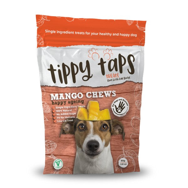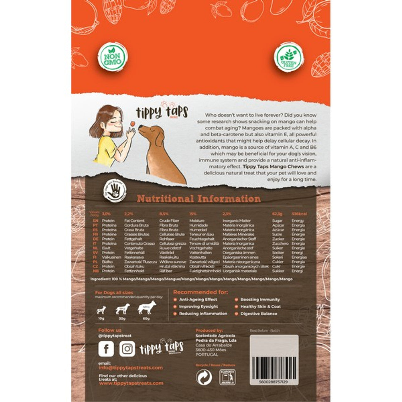 Tippy Taps Mango Chews are the ultimate treat for your pet. Mangoes are packed with alpha and beta-carotene but also vitamin E, all powerful antioxidants your dog will for sure enjoy. In addition, mango is a source of vitamin A, Vitamin C to maintain good levels of collagen and Vitamin B6 a natural anti-inflamatory. Tippy Taps Mango Chews are a delicious natural treat that your pet will love and enjoy for a long time.