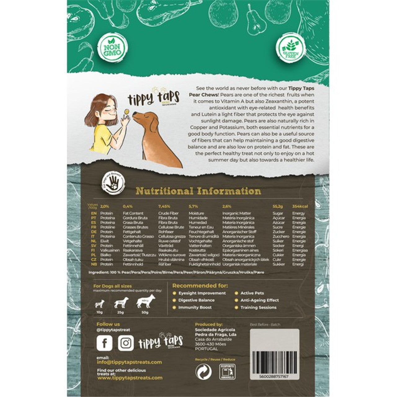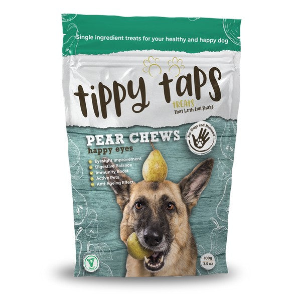 See the world as never before with our Tippy Taps Pear Chews! Pears are one of the richest fruits when it comes to Vitamin A but also Zeaxanthin, a potent antioxidant with eye-related health benefits and Lutein a light fiber that protects the eye against sunlight damage. Pears are also naturally rich in Copper and Potassium, both essential nutrients for a good body function. Pear Chews can also be a useful source of fibers that can help maintaining a good digestive balance and are also low on protein and fat. These are the perfect healthy treat not only for both to enjoy on a hot summer day but also towards a healthier life.