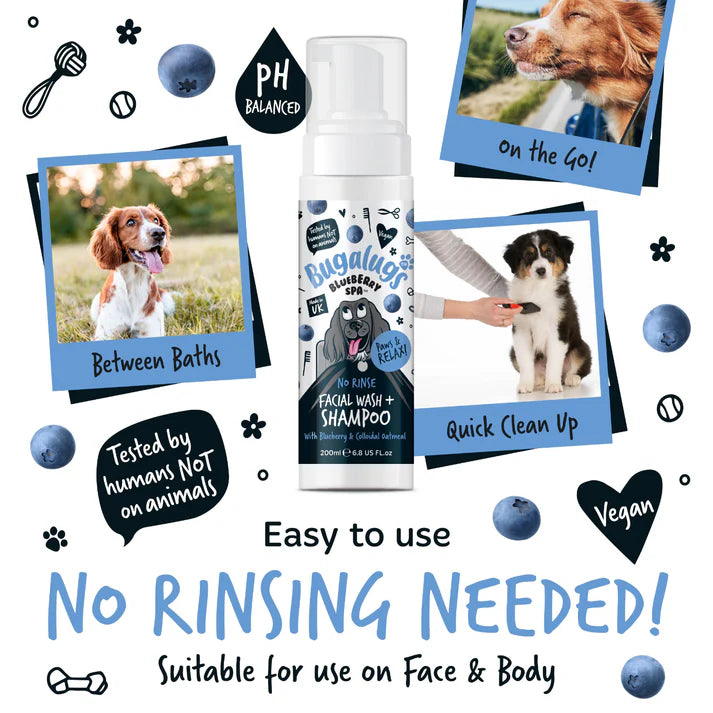 Treat your dog to a touch of luxury with Bugalugs Blueberry Spa, No Rinse Facial Wash and Shampoo - expertly formulated to gently cleanse, refresh and brighten the most sensitive area: the face, while also doubling as a convenient, waterless shampoo for the rest of the coat.
