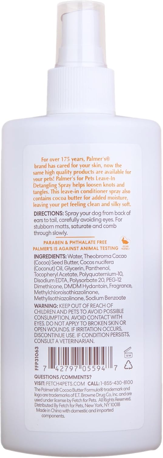 For over 175 years, Palmer's® brand has cared for your skin, now the same high quality products are available for your pets! Palmer's for Pets Leave-In Detangling Spray helps loosen knots and tangles. This leave-in conditioner spray also contains cocoa butter for added moisture, leaving your pet feeling clean and silky soft. If your pet has fur that easily tangles or gets matted, using a detangling spray regularly can help to reduce the effort it takes to brush and groom. Leave-in dog conditioners are also excellent for dogs with dry, brittle, and generally unkempt fur. For a softer, silkier, and better-smelling pooch, try Palmer™s for Pets Detangling & Conditioning Spray with Cocoa Butter and Vitamin E.
